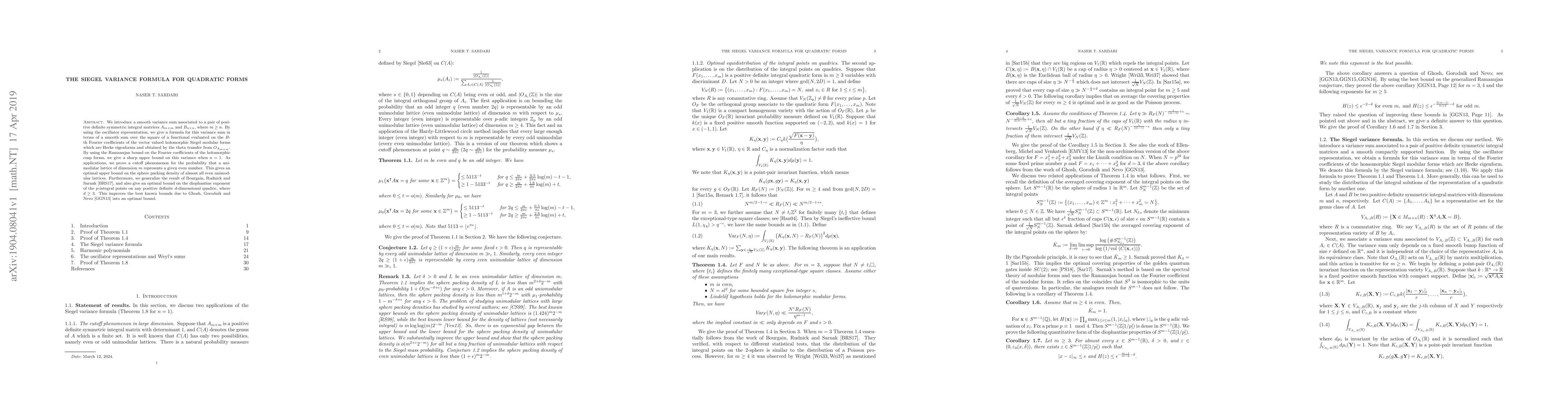 We introduce a smooth variance sum associated to a pair of positive definite symmetric integral matrices $A_{m\times m}$ and $B_{n\times n}$, where $m\geq n$. By using the oscillator representation, we give a formula for this variance sum in terms of a smooth sum over the square of a functional evaluated on the $B$-th Fourier coefficients of the vector valued holomorphic Siegel modular forms which are Hecke eigenforms and obtained by the theta transfer from $O_{A_{m\times m}}$. By using the Ramanujan bound on the Fourier coefficients of the holomorphic cusp forms, we give a sharp upper bound on this variance when $n=1$. As applications, we prove a cutoff phenomenon for the probability that a unimodular lattice of dimension $m$ represents a given even number. This gives an optimal upper bound on the sphere packing density of almost all even unimodular lattices. Furthermore, we generalize the result of Bourgain, Rudnick and Sarnak~\cite{Bourgain}, and also give an optimal bound on the diophantine exponent of the $p$-integral points on any positive definite $d$-dimensional quadric, where $d\geq 3$. This improves the best known bounds due to Ghosh, Gorodnik and Nevo~\cite{GGN} into an optimal bound.