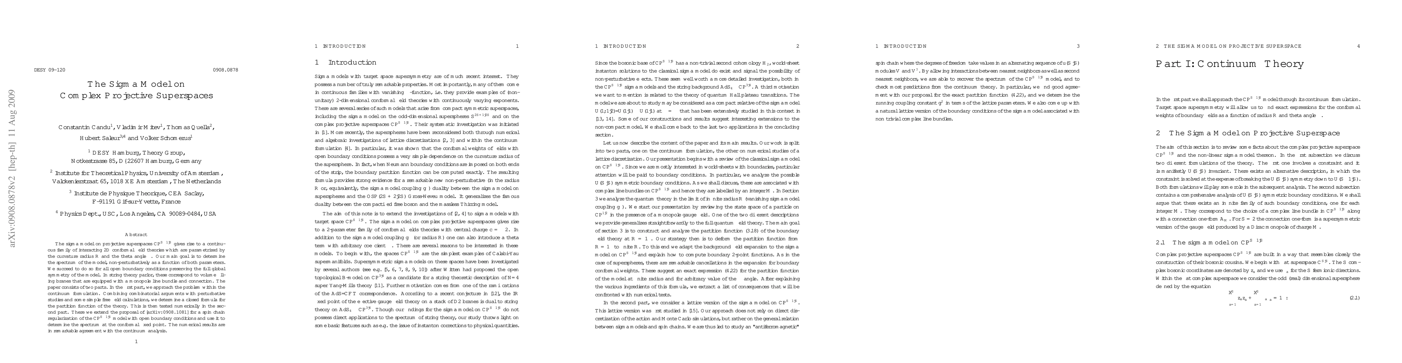 The sigma model on complex projective superspaces CP^{S-1|S} gives rise to a continuous family of interacting 2D conformal field theories which are parametrized by the curvature radius R and the theta angle \theta. Our main goal is to determine the spectrum of the model, non-perturbatively as a function of both parameters. We succeed to do so for all open boundary conditions preserving the full global symmetry of the model. In string theory parlor, these correspond to volume filling branes that are equipped with a monopole line bundle and connection. The paper consists of two parts. In the first part, we approach the problem within the continuum formulation. Combining combinatorial arguments with perturbative studies and some simple free field calculations, we determine a closed formula for the partition function of the theory. This is then tested numerically in the second part. There we propose a spin chain regularization of the CP^{S-1|S} model with open boundary conditions and use it to determine the spectrum at the conformal fixed point. The numerical results are in remarkable agreement with the continuum analysis.