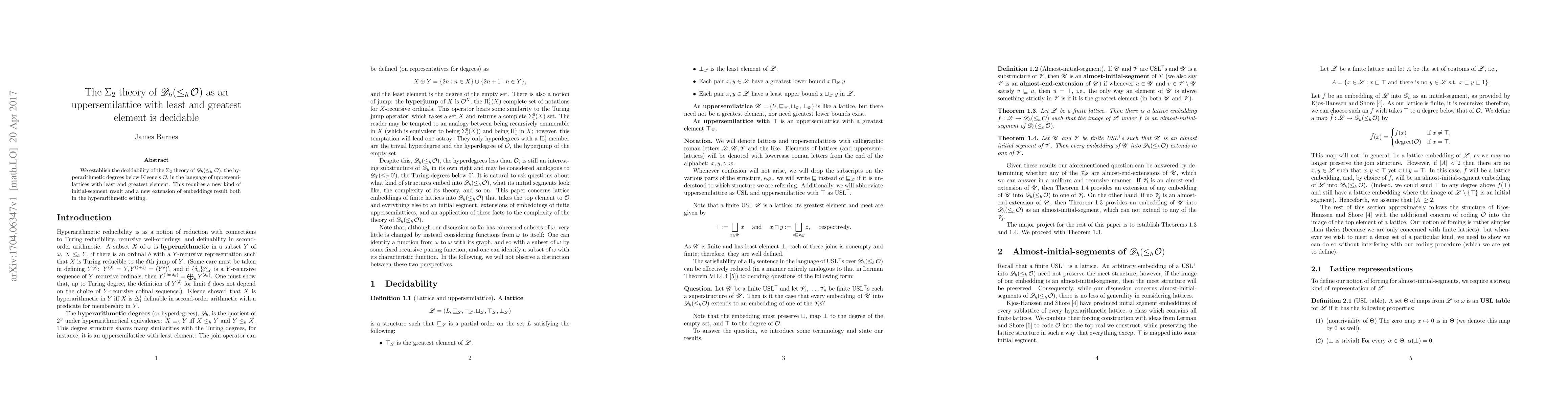 We establish the decidability of the $\Sigma_2$ theory of $\mathscr{D}_h(\leq_h \mathcal{O})$, the hyperarithmetic degrees below Kleene's $\mathcal{O}$, in the language of uppersemilattices with least and greatest element. This requires a new kind of initial-segment result and a new extension of embeddings result both in the hyperarithmetic setting.