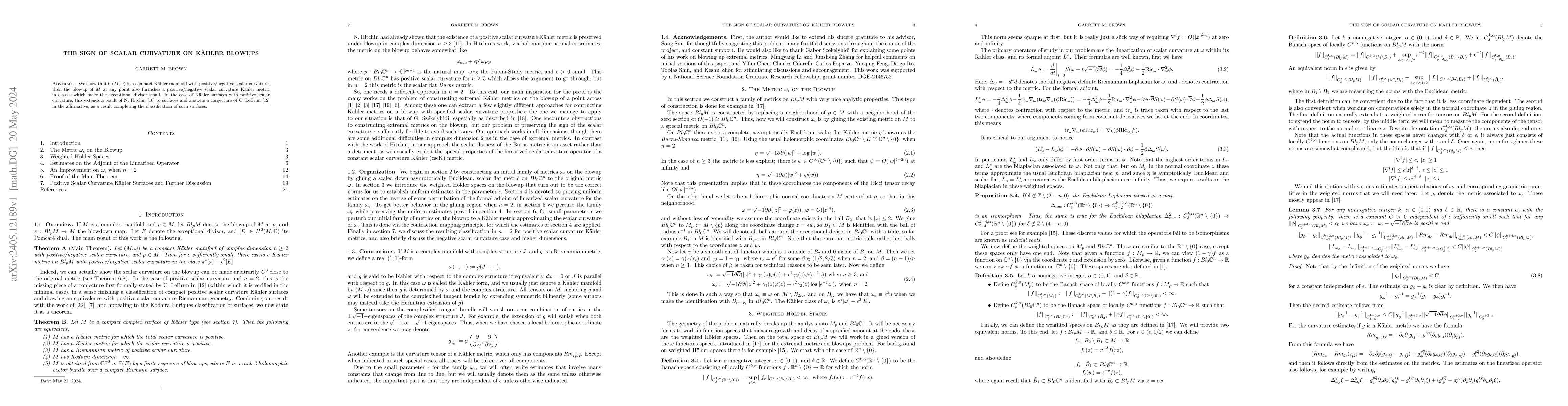 This paper demonstrates that the scalar curvature sign of a compact Kähler manifold $(M,\omega)$ is preserved in its Kähler blowups, maintaining positive or negative scalar curvature in the new exceptional divisor classes. It extends Hitchin's result to Kähler surfaces and confirms LeBrun's conjecture, thus completing the classification of Kähler surfaces with positive scalar curvature.
