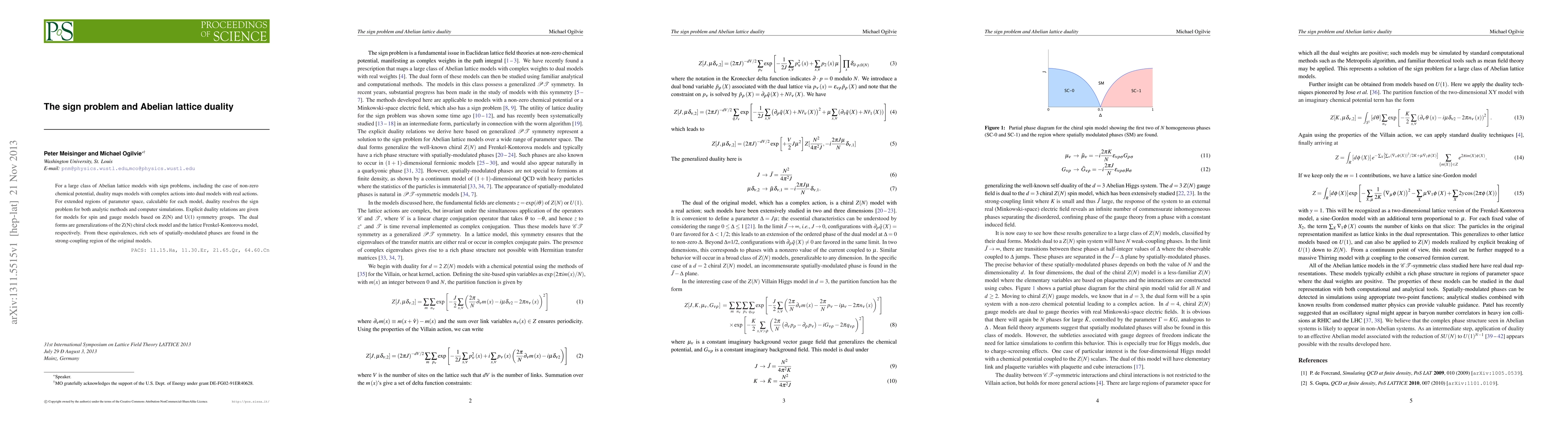 This paper explores Abelian lattice duality to resolve sign problems in Abelian lattice models, including those with non-zero chemical potential. It demonstrates that duality transforms complex-action models into real-action duals, enabling calculations across extended parameter regions, and identifies new spatially-modulated phases in the strong-coupling regime.