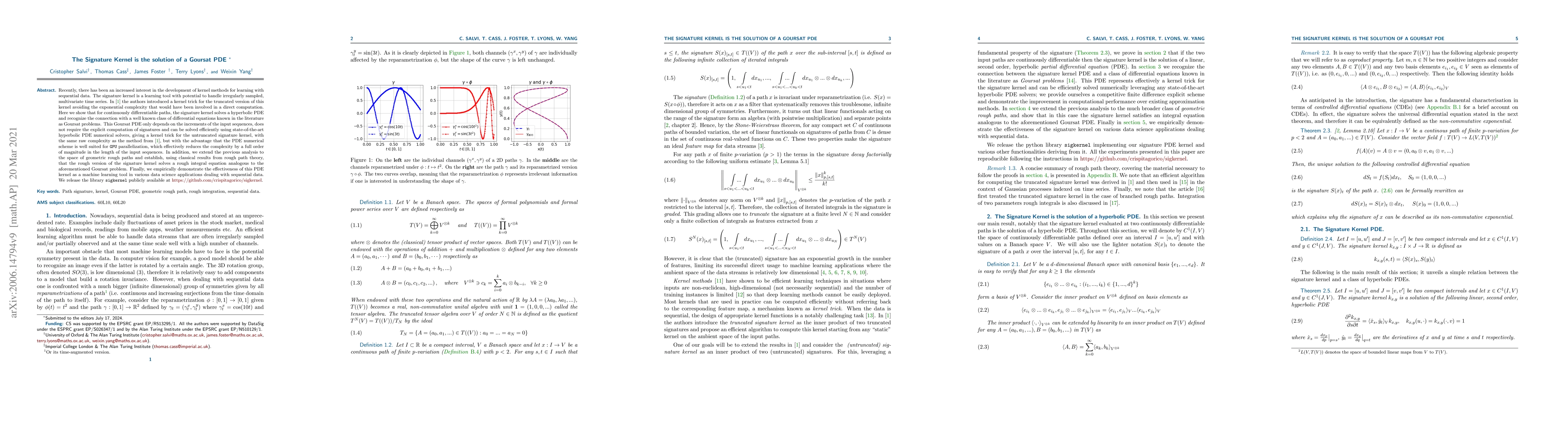 Recently, there has been an increased interest in the development of kernel methods for learning with sequential data. The signature kernel is a learning tool with potential to handle irregularly sampled, multivariate time series. In "Kernels for sequentially ordered data" the authors introduced a kernel trick for the truncated version of this kernel avoiding the exponential complexity that would have been involved in a direct computation. Here we show that for continuously differentiable paths, the signature kernel solves a hyperbolic PDE and recognize the connection with a well known class of differential equations known in the literature as Goursat problems. This Goursat PDE only depends on the increments of the input sequences, does not require the explicit computation of signatures and can be solved efficiently using state-of-the-arthyperbolic PDE numerical solvers, giving a kernel trick for the untruncated signature kernel, with the same raw complexity as the method from "Kernels for sequentially ordered data", but with the advantage that the PDE numerical scheme is well suited for GPU parallelization, which effectively reduces the complexity by a full order of magnitude in the length of the input sequences. In addition, we extend the previous analysis to the space of geometric rough paths and establish, using classical results from rough path theory, that the rough version of the signature kernel solves a rough integral equation analogous to the aforementioned Goursat PDE. Finally, we empirically demonstrate the effectiveness of our PDE kernel as a machine learning tool in various machine learning applications dealing with sequential data. We release the library sigkernel publicly available at https://github.com/crispitagorico/sigkernel.