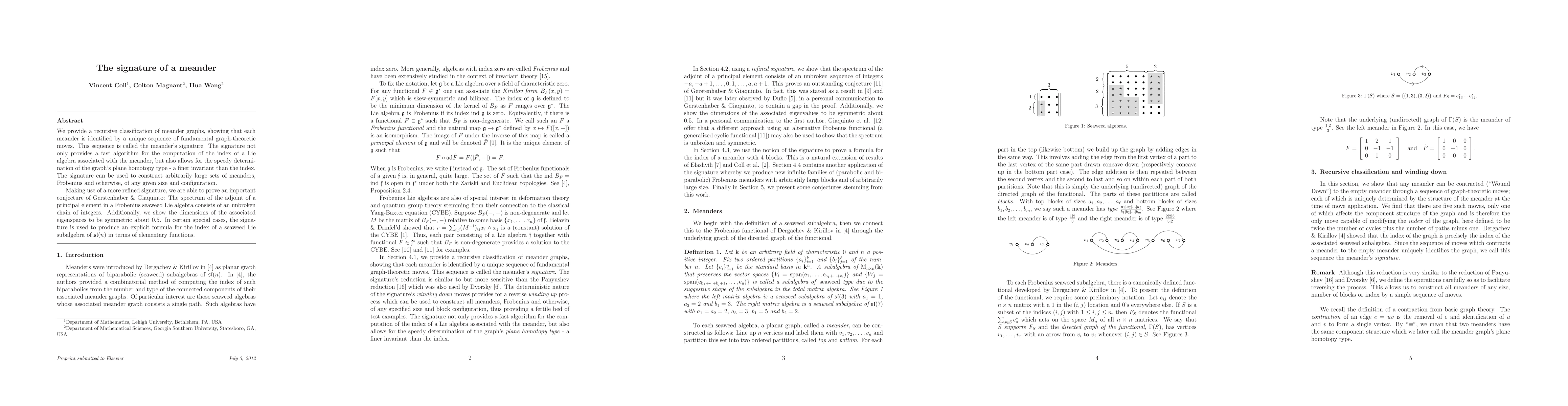 We provide a recursive classification of meander graphs, showing that each meander is identified by a unique sequence of fundamental graph-theoretic moves. This sequence is called the meander's signature. The signature not only provides a fast algorithm for the computation of the index of a Lie algebra associated with the meander, but also allows for the speedy determination of the graph's plane homotopy type - a finer invariant than the index. The signature can be used to construct arbitrarily large sets of meanders, Frobenius and otherwise, of any given size and configuration. Making use of a more refined signature, we are able to prove an important conjecture of Gerstenhaber & Giaquinto: The spectrum of the adjoint of a principal element in a Frobenius seaweed Lie algebra consists of an unbroken chain of integers. Additionally, we show the dimensions of the associated eigenspaces to be unimodal. In certain special cases, the signature is used to produce an explicit formula for the index of a seaweed Lie subalgebra of sl(n) in terms of elementary functions.