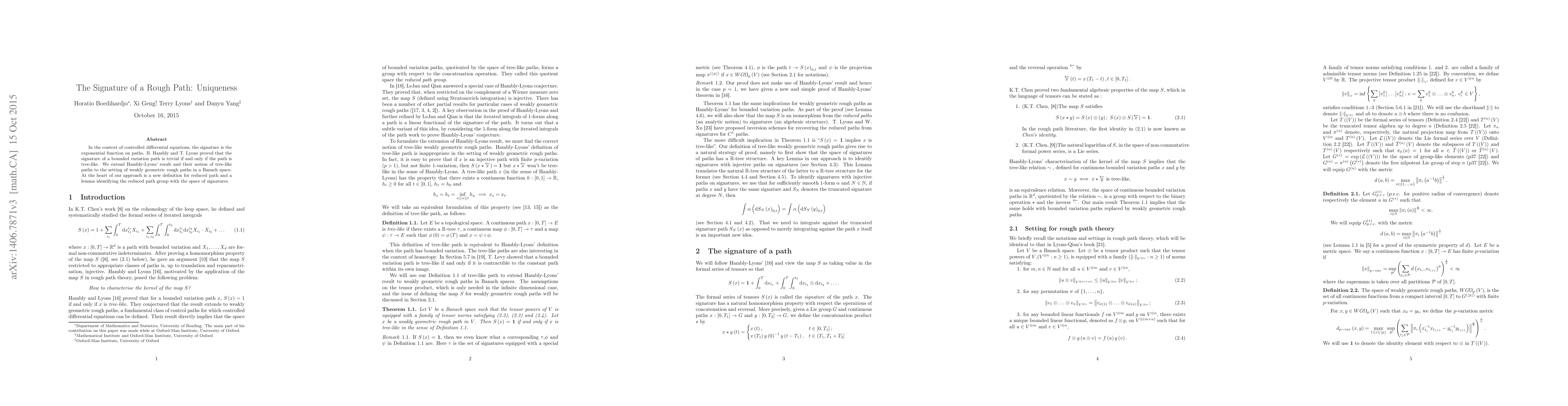 In the context of controlled differential equations, the signature is the exponential function on paths. B. Hambly and T. Lyons proved that the signature of a bounded variation path is trivial if and only if the path is tree-like. We extend Hambly-Lyons' result and their notion of tree-like paths to the setting of weakly geometric rough paths in a Banach space. At the heart of our approach is a new definition for reduced path and a lemma identifying the reduced path group with the space of signatures.