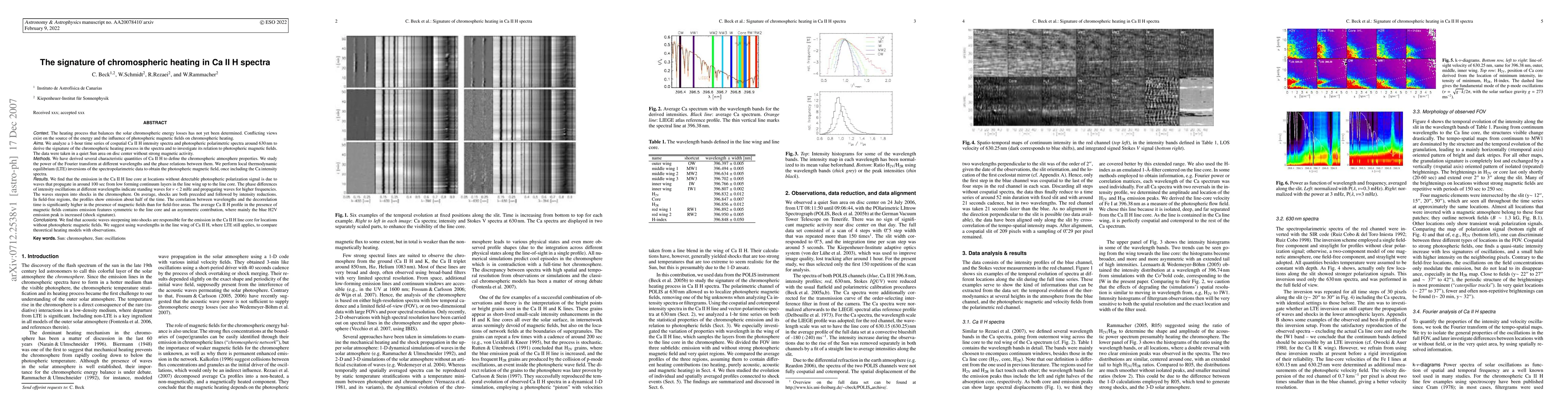 We analyze a 1-hour time series of Ca II H intensity spectra and polarimetric spectra around 630 nm to derive the signature of the chromospheric heating and to investigate its relation to magnetic fields. We derived several characteristic quantities of Ca II H to define the chromospheric atmosphere properties. We study the power of the Fourier transform at different wavelengths and their phase relations. We perform local thermodynamic equilibrium inversions of the data to obtain the magnetic field, once including the Ca spectra. We find that the emission in the Ca II H line core at locations without detectable photospheric polarization signal is due to waves that propagate from low forming continuum layers in the line wing up to the line core. The phase differences of intensity oscillations at different wavelengths indicate standing waves for v < 2 mHz and propagating waves for higher frequencies. The waves steepen into shocks in the chromosphere. On average, shocks are both preceded and followed by intensity reductions. In field-free regions, the profiles show emission about half of the time. The correlation between wavelengths and the decorrelation time is significantly higher in the presence of magnetic fields than for field-free areas. The average Ca II H profile in the presence of magnetic fields contains emission features symmetric to the line core and an asymmetric contribution, where mainly the blue H2V emission peak is increased. We find that acoustic waves steepening into shocks are responsible for the emission in the Ca II H line core for locations without photospheric magnetic fields. We suggest using wavelengths in the line wing of Ca II H, where LTE still applies, to compare theoretical heating models with observations.