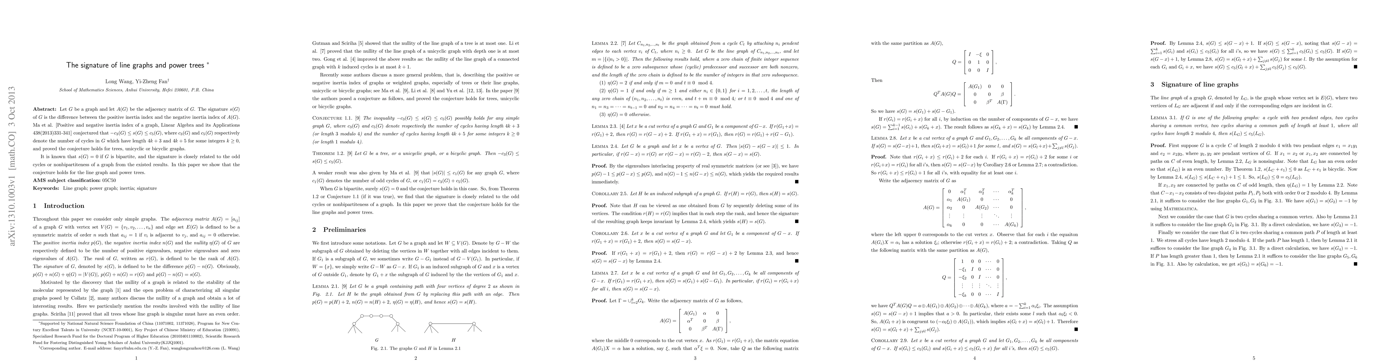 Let $G$ be a graph and let $A(G)$ be the adjacency matrix of $G$. The signature $s(G)$ of $G$ is the difference between the positive inertia index and the negative inertia index of $A(G)$. Ma et al. [Positive and negative inertia index of a graph, Linear Algebra and its Applications 438(2013)331-341] conjectured that $-c_3(G)\leq s(G)\leq c_5(G),$ where $c_3(G)$ and $c_5(G)$ respectively denote the number of cycles in $G$ which have length $4k+3$ and $4k+5$ for some integers $k \ge 0$, and proved the conjecture holds for trees, unicyclic or bicyclic graphs. It is known that $s(G)=0$ if $G$ is bipartite, and the signature is closely related to the odd cycles or nonbipartiteness of a graph from the existed results. In this paper we show that the conjecture holds for the line graph and power trees.
