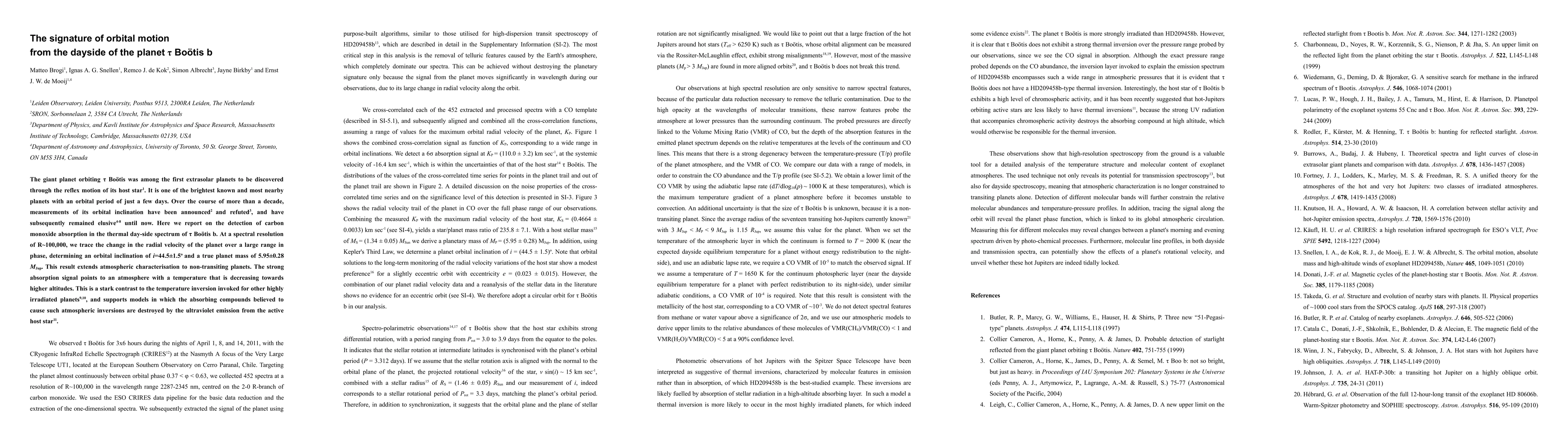 This paper reports the detection of carbon monoxide absorption in the thermal day-side spectrum of the giant planet tau Bootis b, determining its orbital inclination and true mass. The strong absorption signal indicates an atmosphere with a temperature decreasing towards higher altitudes, contrasting with temperature inversions seen in other highly irradiated planets.