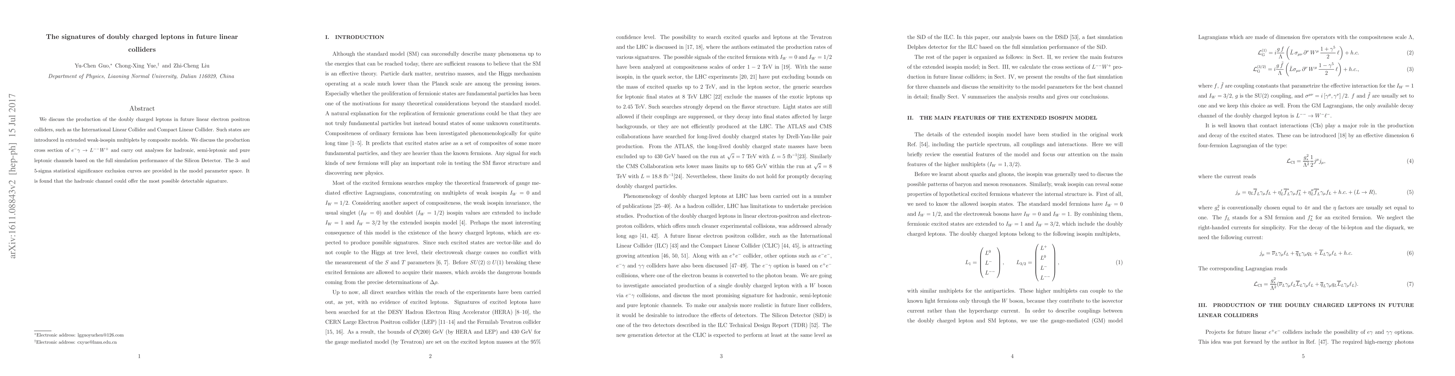 We discuss the production of the doubly charged leptons in future linear electron positron colliders, such as the International Linear Collider and Compact Linear Collider. Such states are introduced in extended weak-isospin multiplets by composite models. We discuss the production cross section of $e^-\gamma\rightarrow L^{--}W^{+}$ and carry out analyses for hadronic, semi-leptonic and pure leptonic channels based on the full simulation performance of the Silicon Detector. The 3- and 5-sigma statistical significance exclusion curves are provided in the model parameter space. It is found that the hadronic channel could offer the most possible detectable signature.