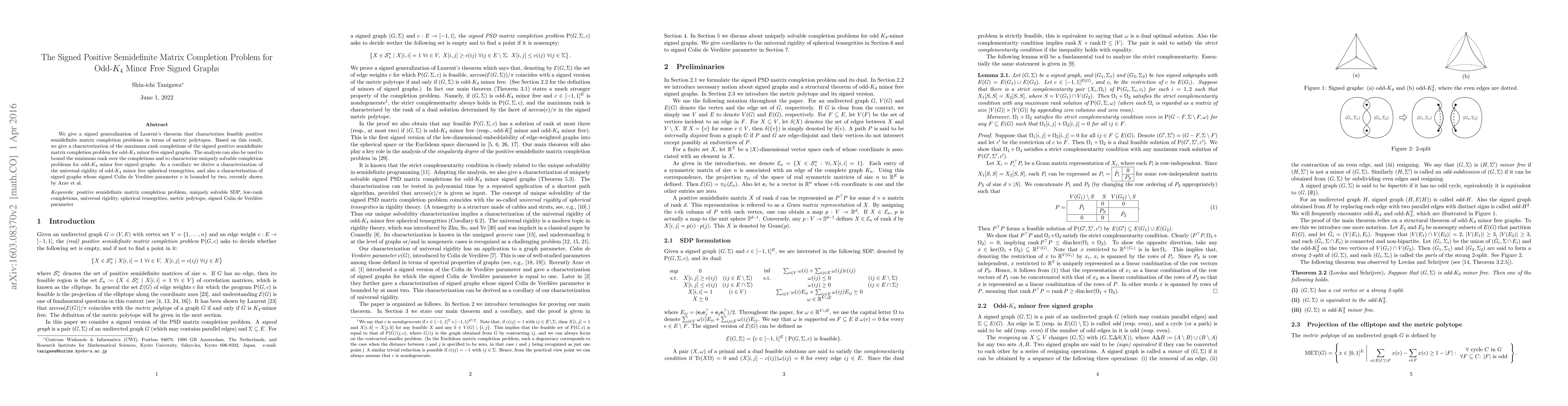 We give a signed generalization of Laurent's theorem that characterizes feasible positive semidefinite matrix completion problems in terms of metric polytopes. Based on this result, we give a characterization of the maximum rank completions of the signed positive semidefinite matrix completion problem for odd-$K_4$ minor free signed graphs. The analysis can also be used to bound the minimum rank over the completions and to characterize uniquely solvable completion problems for odd-$K_4$ minor free signed graphs. As a corollary we derive a characterization of the universal rigidity of odd-$K_4$ minor free spherical tensegrities, and also a characterization of signed graphs whose signed Colin de Verdi\`ere parameter $\nu$ is bounded by two, recently shown by Arav et al.