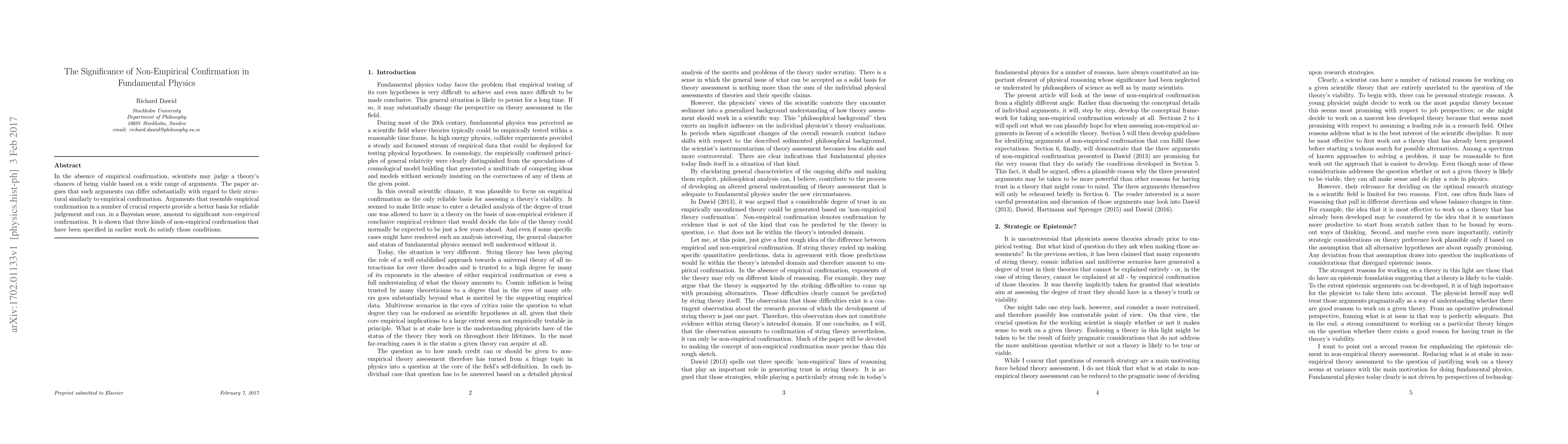 This paper explores how non-empirical arguments can serve as significant confirmation for viable theories in fundamental physics, especially when empirical evidence is lacking. It identifies three types of non-empirical confirmation that closely resemble empirical validation, thereby providing a robust basis for theory assessment.