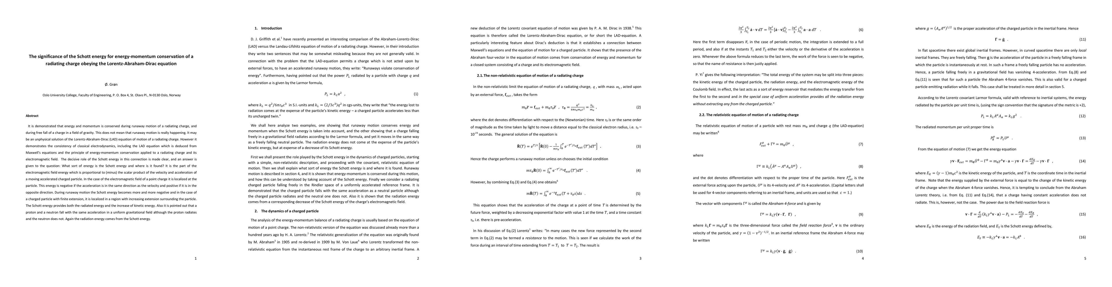Summary: This paper demonstrates energy conservation in the runaway motion of a radiating charge and during gravitational free fall, highlighting the crucial role of the Schott energy. It also reveals that a proton and neutron experience the same gravitational acceleration despite the proton's radiation.