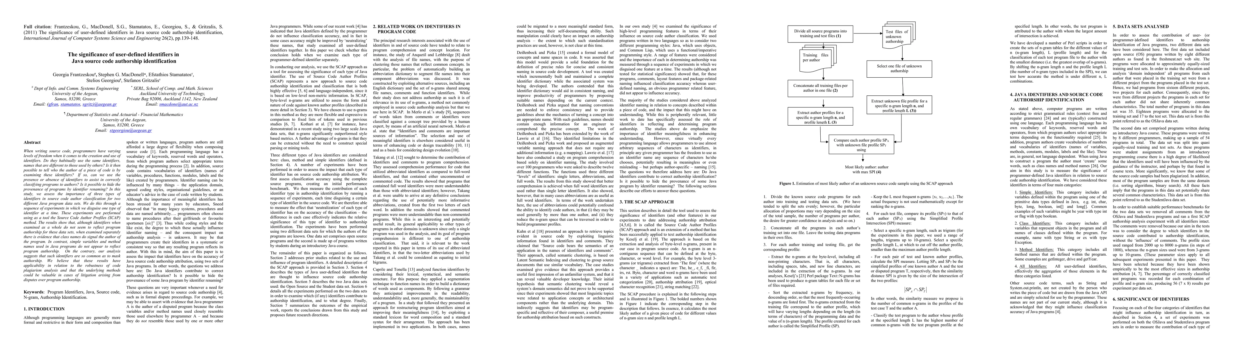 This research contributes to the field of authorship analysis by introducing a new technique that leverages linguistic patterns in source code to identify authors.