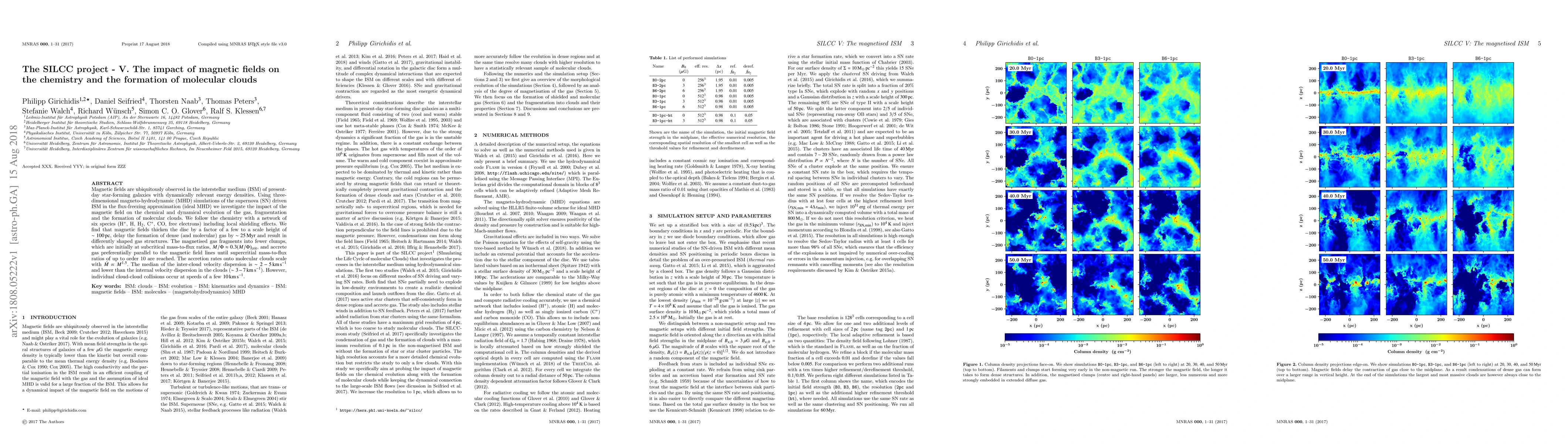 The SILCC project investigates the impact of magnetic fields on the chemistry and formation of molecular clouds using MHD simulations. Magnetic fields thicken the gas disc, delay dense gas formation by ~25 Myr, and result in differently shaped gas structures, with accretion rates scaling as $\dot{M}\propto M^{1.5}$.