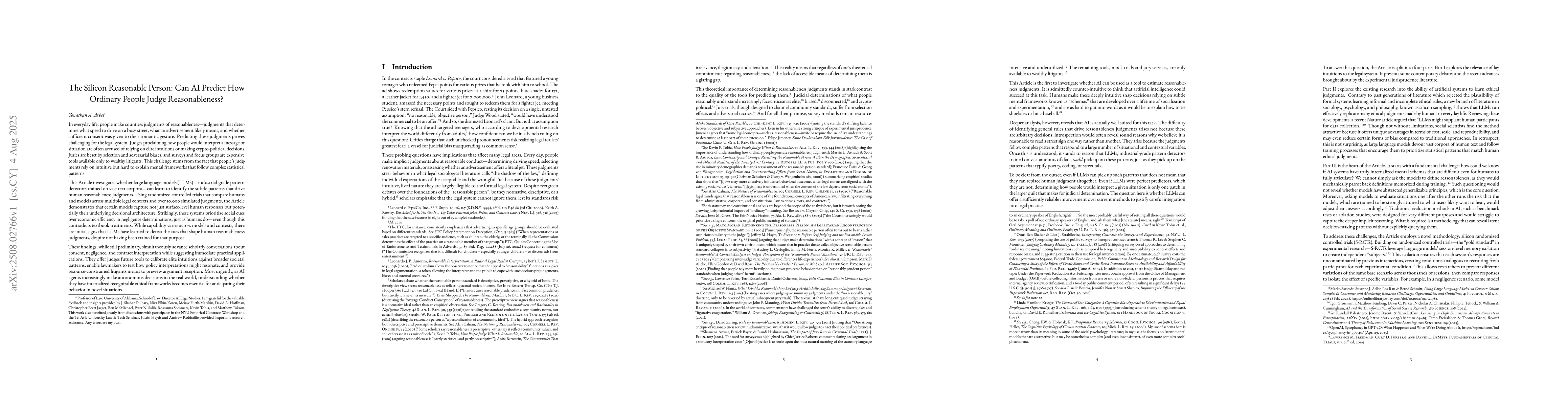 In everyday life, people make countless reasonableness judgments that determine appropriate behavior in various contexts. Predicting these judgments challenges the legal system, as judges' intuitions may not align with broader societal views. This Article investigates whether large language models (LLMs) can learn to identify patterns driving human reasonableness judgments. Using randomized controlled trials comparing humans and models across multiple legal contexts with over 10,000 simulated judgments, we demonstrate that certain models capture not just surface-level responses but potentially their underlying decisional architecture. Strikingly, these systems prioritize social cues over economic efficiency in negligence determinations, mirroring human behavior despite contradicting textbook treatments. These findings suggest practical applications: judges could calibrate intuitions against broader patterns, lawmakers could test policy interpretations, and resource-constrained litigants could preview argument reception. As AI agents increasingly make autonomous real-world decisions, understanding whether they've internalized recognizable ethical frameworks becomes essential for anticipating their behavior.