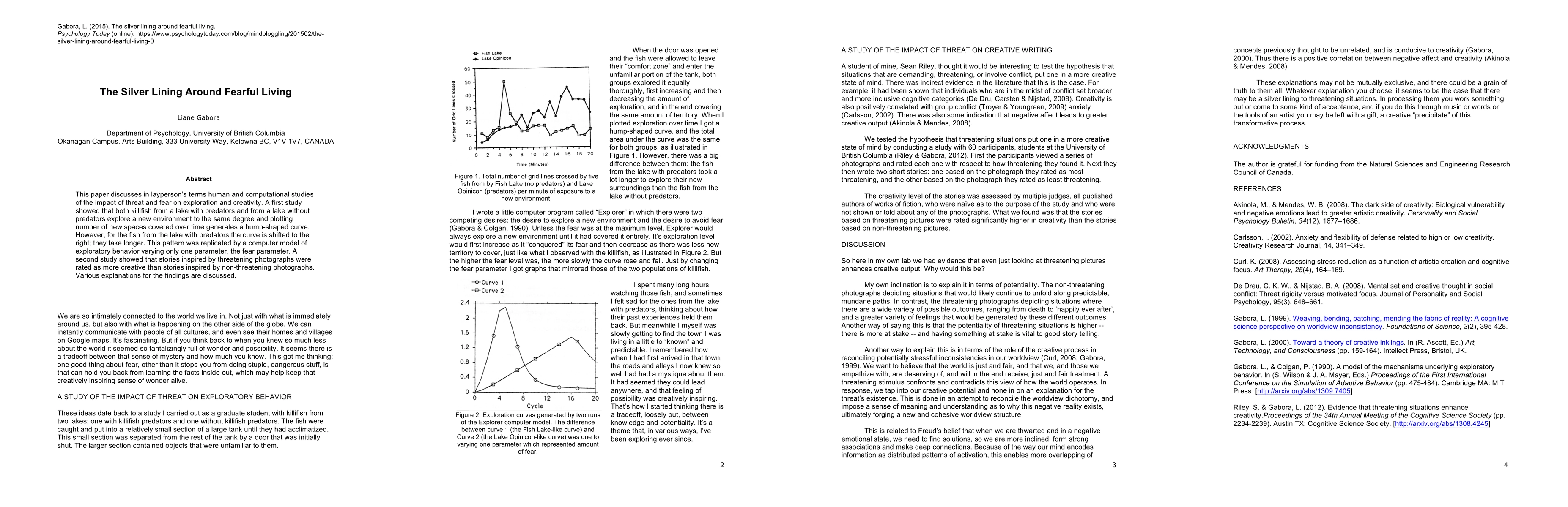 This paper discusses in layperson's terms human and computational studies of the impact of threat and fear on exploration and creativity. A first study showed that both killifish from a lake with predators and from a lake without predators explore a new environment to the same degree and plotting number of new spaces covered over time generates a hump-shaped curve. However, for the fish from the lake with predators the curve is shifted to the right; they take longer. This pattern was replicated by a computer model of exploratory behavior varying only one parameter, the fear parameter. A second study showed that stories inspired by threatening photographs were rated as more creative than stories inspired by non-threatening photographs. Various explanations for the findings are discussed.