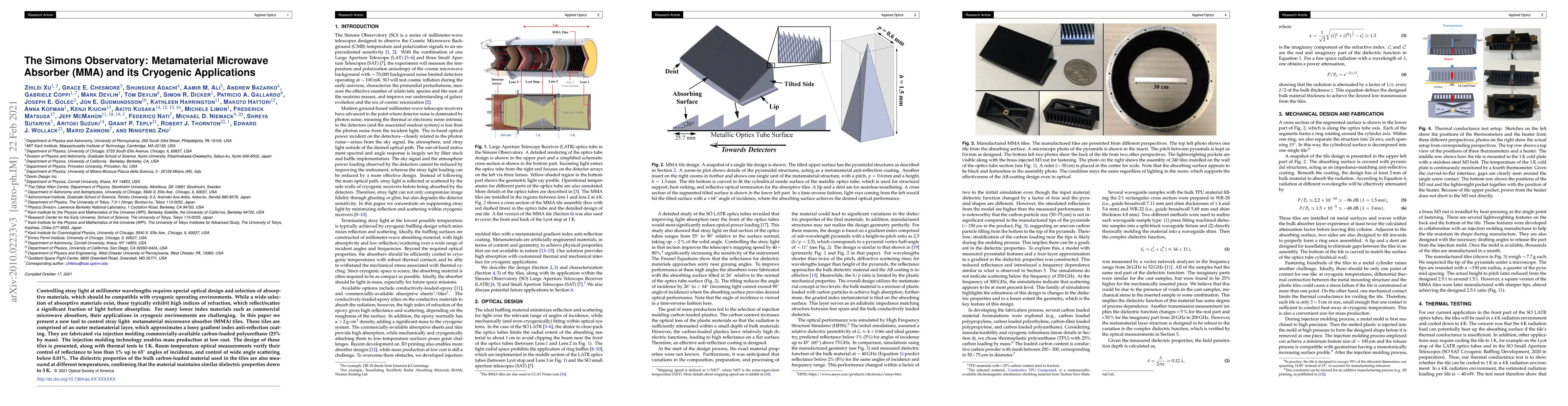 The Simons Observatory introduces metamaterial microwave absorber tiles designed to control stray light at millimeter wavelengths, featuring an outer metamaterial layer that functions as a lossy gradient index anti-reflection coating. These tiles, made from carbon-loaded polyurethane, demonstrate reflectance control below 1% and wide-angle scattering below 0.01%, maintaining performance down to 3 K.