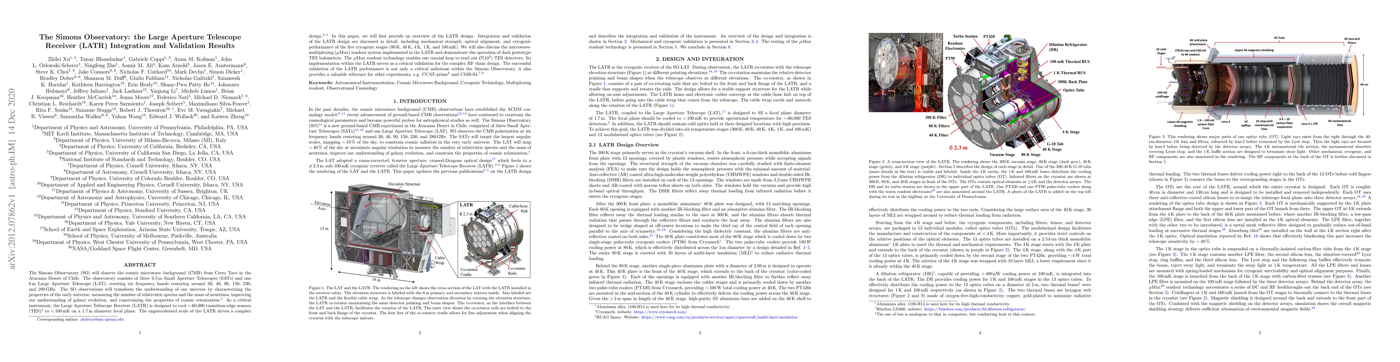 The Simons Observatory's Large Aperture Telescope Receiver (LATR) integrates and validates a complex design to cool 60,000 transition-edge sensors to below 100 mK, showcasing mechanical, optical, and cryogenic performance across five stages. The microwave-multiplexing readout system validates the LATR's RF chain design, enabling efficient readout of numerous detectors.