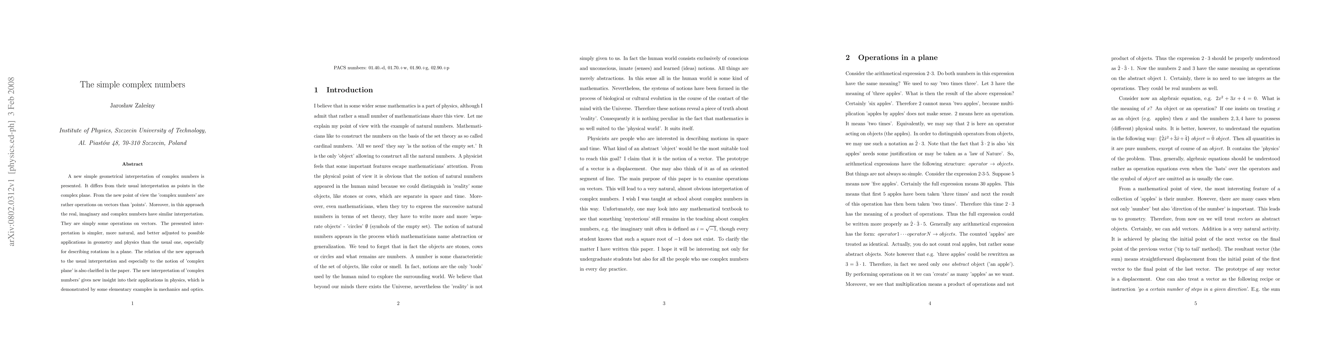 A new simple geometrical interpretation of complex numbers is presented. It differs from their usual interpretation as points in the complex plane. From the new point of view the complex numbers are rather operations on vectors than points. Moreover, in this approach the real, imaginary and complex numbers have similar interpretation. They are simply some operations on vectors. The presented interpretation is simpler, more natural, and better adjusted to possible applications in geometry and physics than the usual one, especially for describing rotations in a plane. The relation of the new approach to the usual interpretation and especially to the notion of complex plane is also clarified in the paper. The new interpretation of complex numbers gives new insight into their applications in physics, which is demonstrated by some elementary examples in mechanics and optics