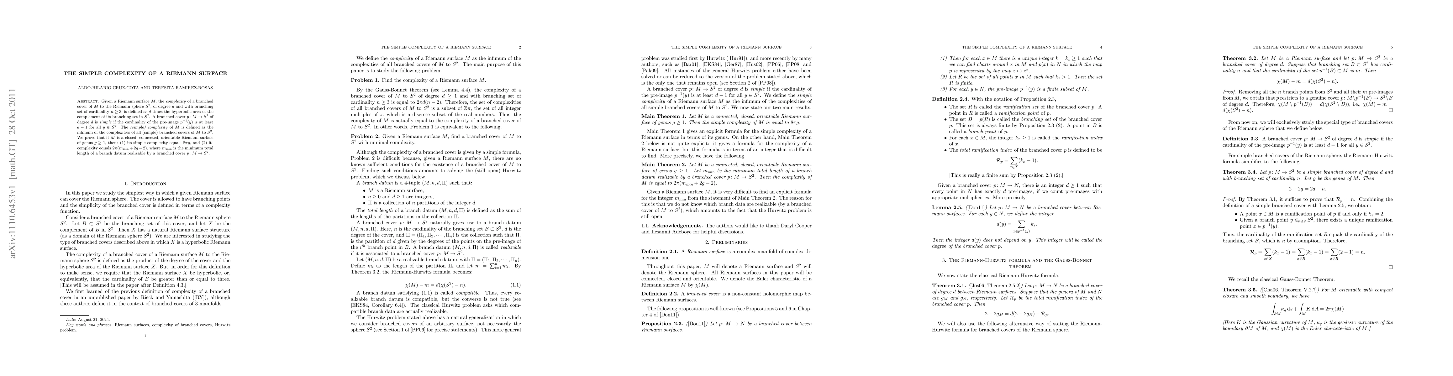 \noindent Given a Riemann surface $M$, the \emph{complexity} of a branched cover of $M$ to the Riemann sphere $S^2$, of degree $d$ and with branching set of cardinality $n \geq 3$, is defined as $d$ times the hyperbolic area of the complement of its branching set in $S^2$. A branched cover $p \colon M \to S^2$ of degree $d$ is \emph{simple} if the cardinality of the pre-image $p^{-1}(y)$ is at least $d-1$ for all $y \in S^2$. The \emph{(simple) complexity} of $M$ is defined as the infimum of the complexities of all (simple) branched covers of $M$ to $S^2$. We prove that if $M$ is a closed, connected, orientable Riemann surface of genus $g \geq 1$, then: (1) its simple complexity equals $8\pi g$, and (2) its complexity equals $2\pi(m_{\text{min}}+2g-2)$, where $m_{\text{min}}$ is the minimum total length of a branch datum realizable by a branched cover $p \colon M \to S^2$.