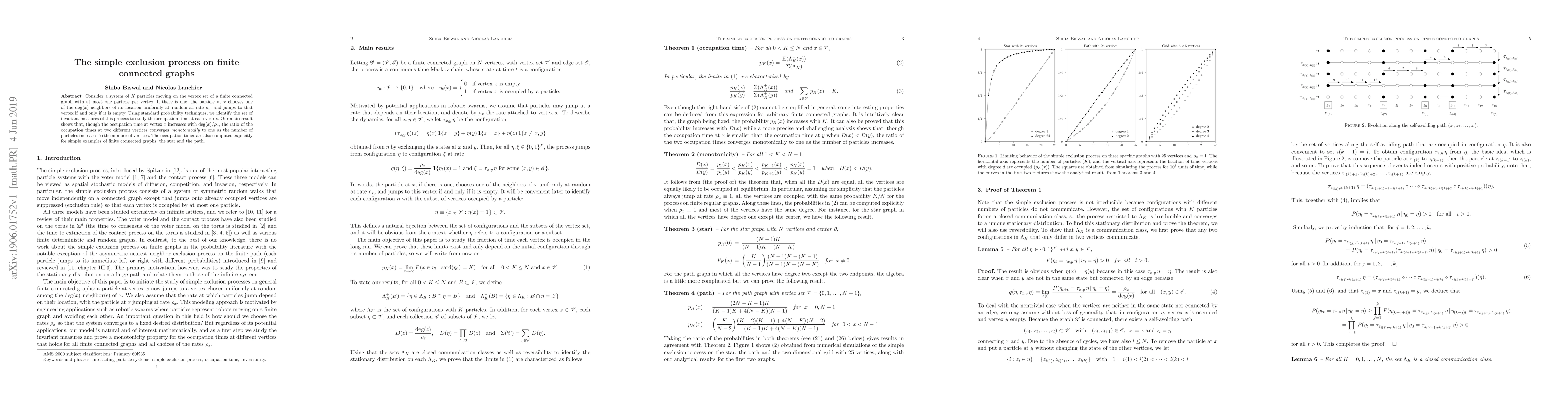 Consider a system of $K$ particles moving on the vertex set of a finite connected graph with at most one particle per vertex. If there is one, the particle at $x$ chooses one of the $\hbox{deg} (x)$ neighbors of its location uniformly at random at rate $\rho_x$, and jumps to that vertex if and only if it is empty. Using standard probability techniques, we identify the set of invariant measures of this process to study the occupation time at each vertex. Our main result shows that, though the occupation time at vertex $x$ increases with $\hbox{deg} (x) / \rho_x$, the ratio of the occupation times at two different vertices converges monotonically to one as the number of particles increases to the number of vertices. The occupation times are also computed explicitly for simple examples of finite connected graphs: the star and the path.