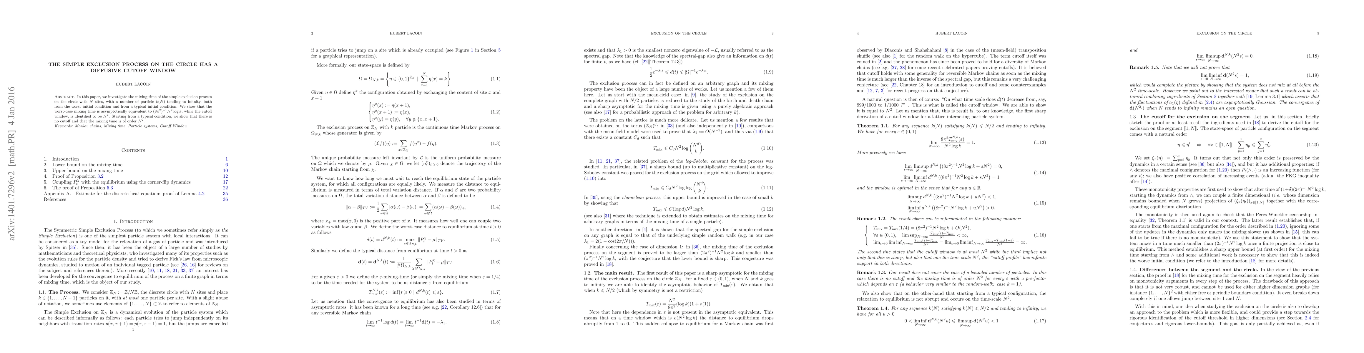 This paper examines the mixing time of the simple exclusion process on a circle with $N$ sites and a growing number of particles $k(N)$. It reveals a diffusive cutoff window of size $N^2$ for the worst-case scenario, while typical initial conditions do not exhibit a cutoff, with mixing time scaling as $N^2$.