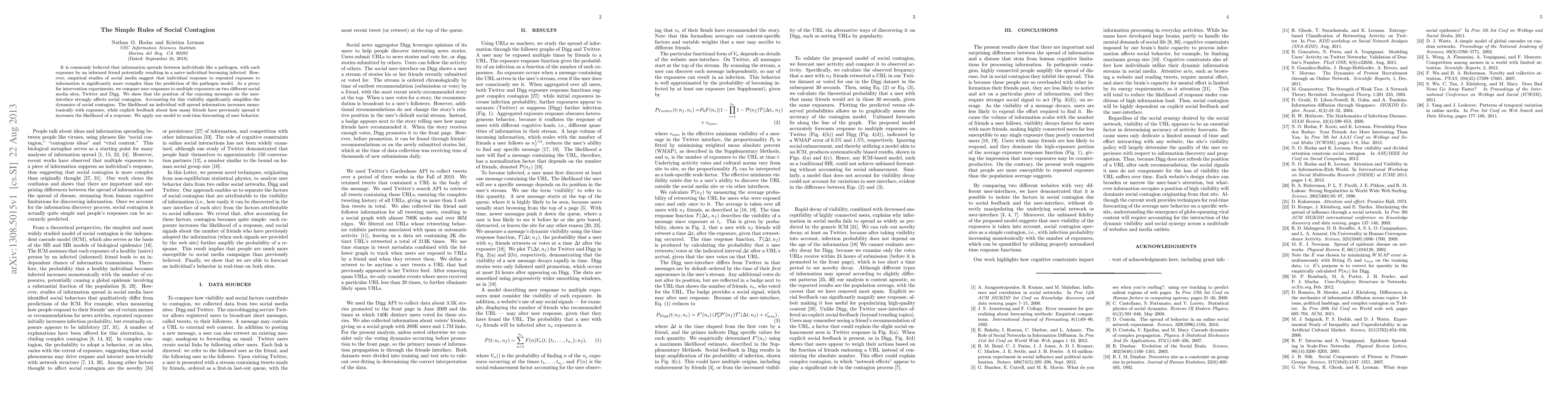 It is commonly believed that information spreads between individuals like a pathogen, with each exposure by an informed friend potentially resulting in a naive individual becoming infected. However, empirical studies of social media suggest that individual response to repeated exposure to information is significantly more complex than the prediction of the pathogen model. As a proxy for intervention experiments, we compare user responses to multiple exposures on two different social media sites, Twitter and Digg. We show that the position of the exposing messages on the user-interface strongly affects social contagion. Accounting for this visibility significantly simplifies the dynamics of social contagion. The likelihood an individual will spread information increases monotonically with exposure, while explicit feedback about how many friends have previously spread it increases the likelihood of a response. We apply our model to real-time forecasting of user behavior.
