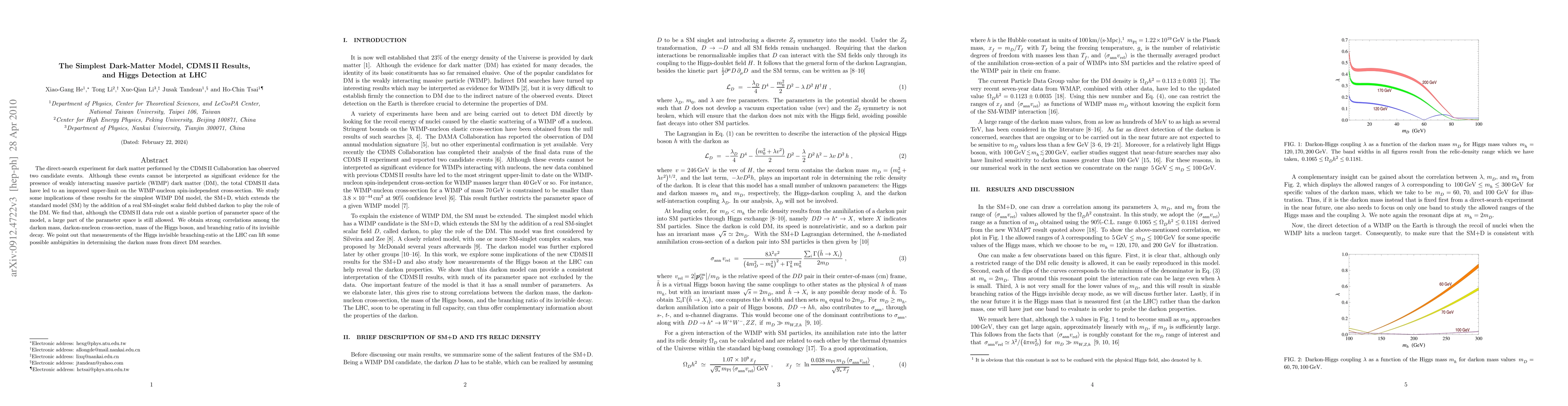 The CDMS II experiment observed two candidate events for dark matter, improving the upper limit on WIMP-nucleon cross-section. The results constrain the simplest WIMP DM model, SM+D, but leave significant parameter space open, revealing correlations between darkon properties and Higgs boson decay.