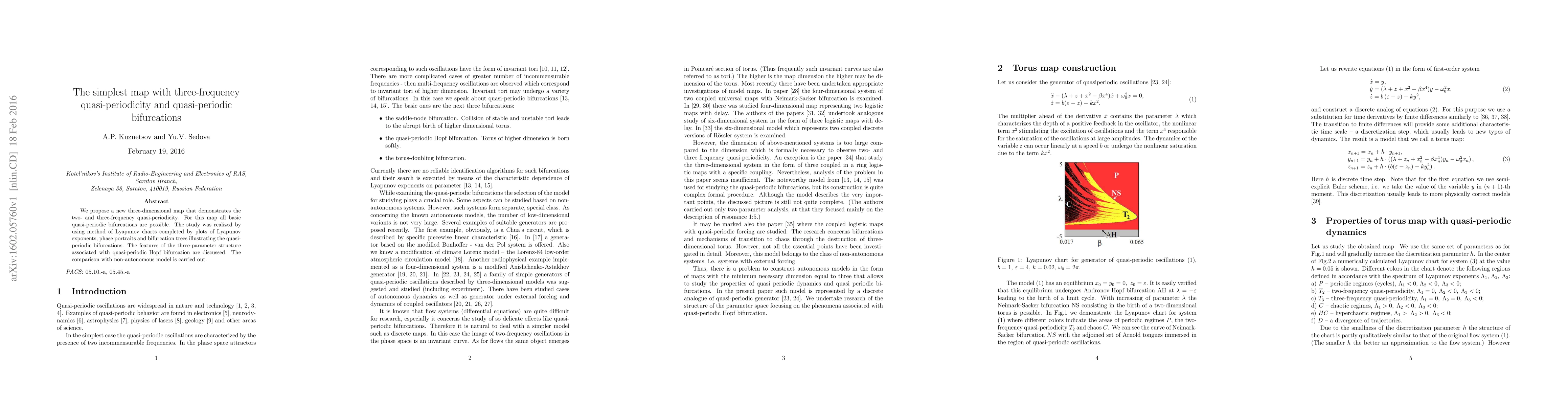 This paper introduces a new three-dimensional map showcasing two- and three-frequency quasi-periodicity, and explores all basic quasi-periodic bifurcations using Lyapunov charts and other analytical methods. It also discusses the three-parameter structure related to quasi-periodic Hopf bifurcation and compares it with a non-autonomous model.