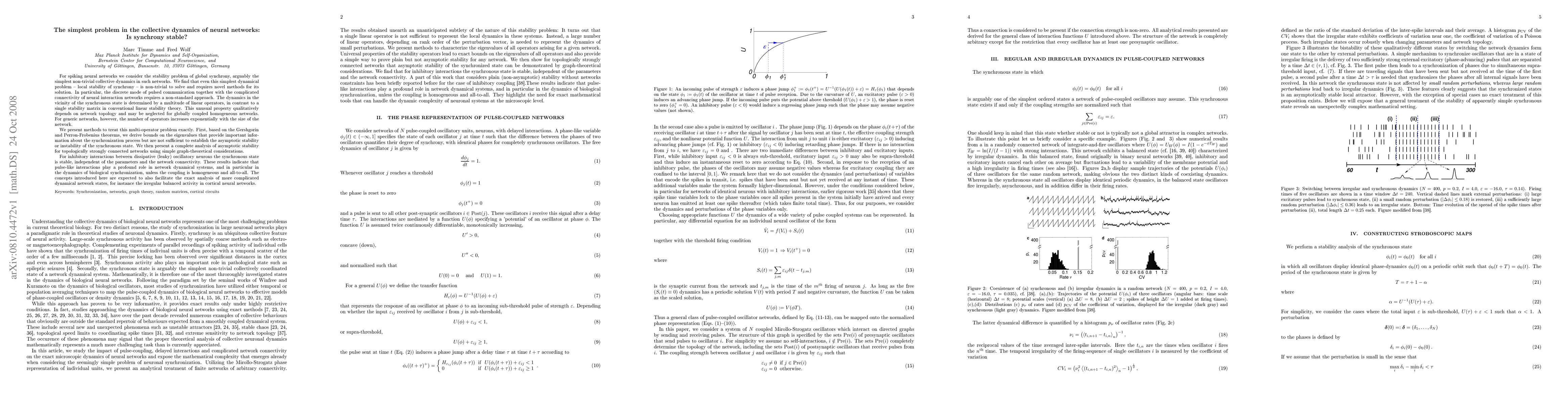 For spiking neural networks we consider the stability problem of global synchrony, arguably the simplest non-trivial collective dynamics in such networks. We find that even this simplest dynamical problem -- local stability of synchrony -- is non-trivial to solve and requires novel methods for its solution. The dynamics in the vicinity of the synchronous state is determined by a multitude of linear operators, in contrast to a single stability matrix in conventional linear stability theory. This unusual property qualitatively depends on network topology and may be neglected for globally coupled homogeneous networks. For generic networks, however, the number of operators increases exponentially with the size of the network. We present methods to treat this multi-operator problem exactly. First, based on the Gershgorin and Perron-Frobenius theorems, we derive bounds on the eigenvalues that provide important information about the synchronization process but are not sufficient to establish the asymptotic stability or instability of the synchronous state. We then present a complete analysis of asymptotic stability for topologically strongly connected networks using simple graph-theoretical considerations. For inhibitory interactions between dissipative (leaky) oscillatory neurons the synchronous state is stable, independent of the parameters and the network connectivity. These results indicate that pulse-like interactions play a profound role in network dynamical systems, and in particular in the dynamics of biological synchronization, unless the coupling is homogeneous and all-to-all.