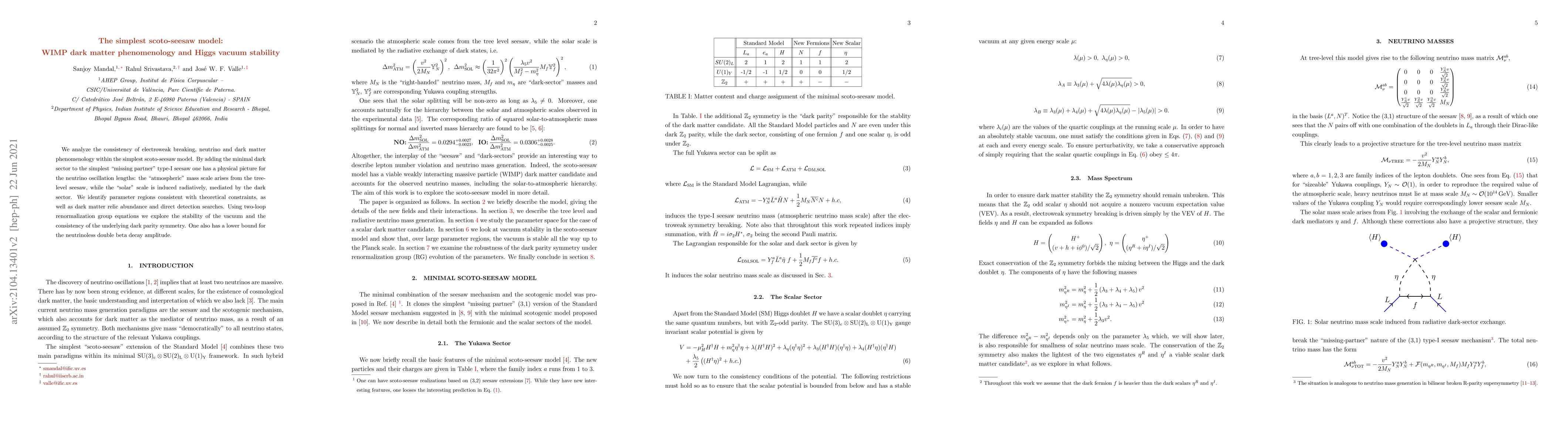 We analyze the consistency of electroweak breaking, neutrino and dark matter phenomenology within the simplest scoto-seesaw model. By adding the minimal dark sector to the simplest "missing partner" type-I seesaw one has a physical picture for the neutrino oscillation lengths: the "atmospheric" mass scale arises from the tree-level seesaw, while the "solar" scale is induced radiatively, mediated by the dark sector. We identify parameter regions consistent with theoretical constraints, as well as dark matter relic abundance and direct detection searches. Using two-loop renormalization group equations we explore the stability of the vacuum and the consistency of the underlying dark parity symmetry. One also has a lower bound for the neutrinoless double beta decay amplitude.