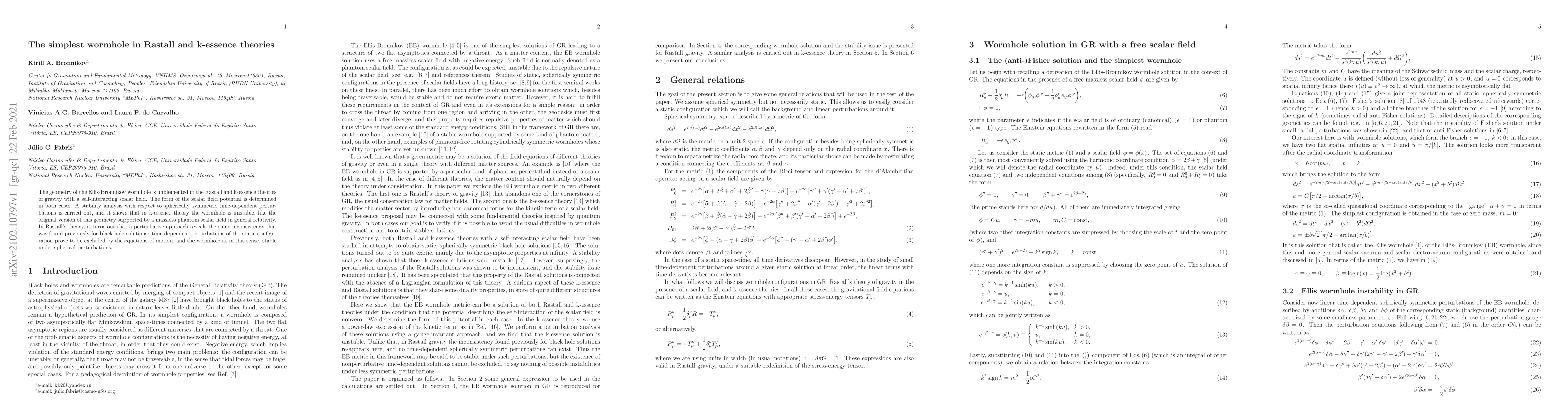 This paper explores the Ellis-Bronnikov wormhole geometry within Rastall and k-essence theories of gravity, determining the scalar field potential in both frameworks. It finds that k-essence wormholes are unstable, similar to their phantom scalar field counterparts, while Rastall's theory shows the wormhole to be stable under spherical perturbations due to inconsistencies in time-dependent perturbations.
