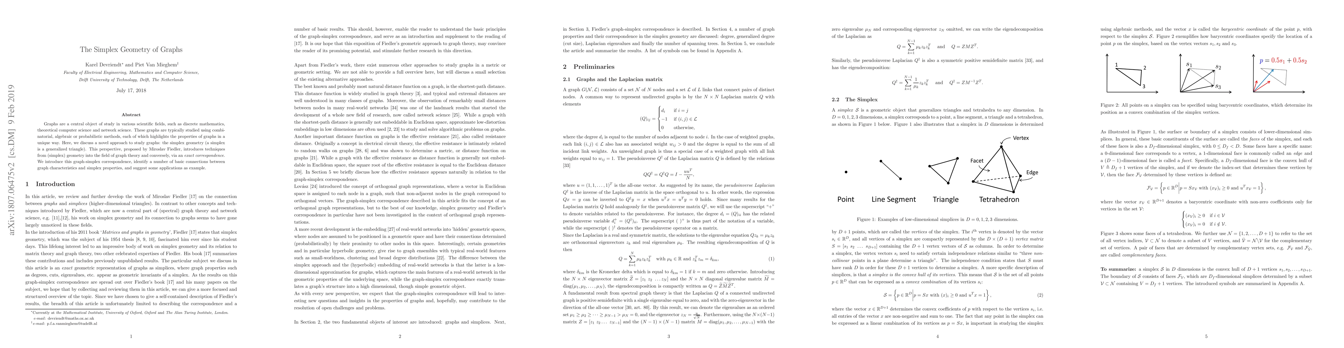 Graphs are a central object of study in various scientific fields, such as discrete mathematics, theoretical computer science and network science. These graphs are typically studied using combinatorial, algebraic or probabilistic methods, each of which highlights the properties of graphs in a unique way. Here, we discuss a novel approach to study graphs: the simplex geometry (a simplex is a generalized triangle). This perspective, proposed by Miroslav Fiedler, introduces techniques from (simplex) geometry into the field of graph theory and conversely, via an exact correspondence. We introduce this graph-simplex correspondence, identify a number of basic connections between graph characteristics and simplex properties, and suggest some applications as example.