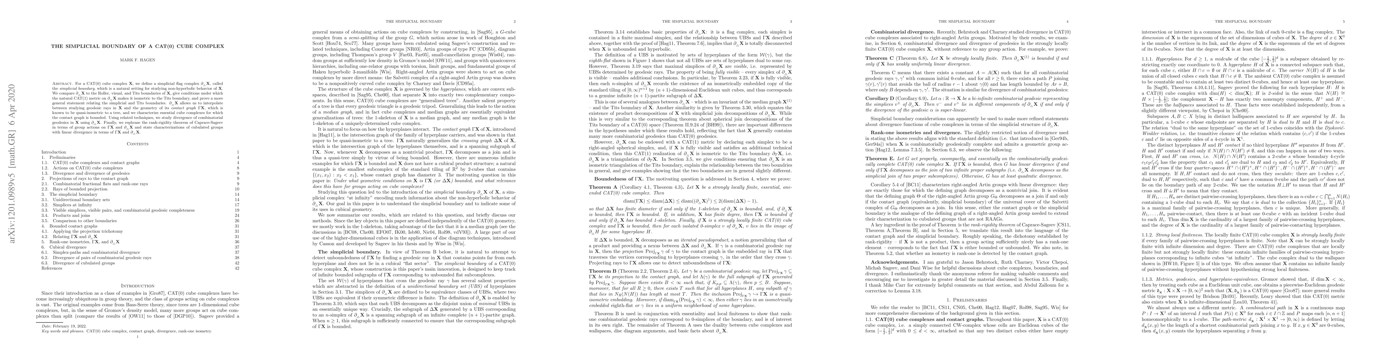 For a CAT(0) cube complex $\mathbf X$, we define a simplicial flag complex $\partial_\Delta\mathbf X$, called the \emph{simplicial boundary}, which is a natural setting for studying non-hyperbolic behavior of $\mathbf X$. We compare $\partial_\Delta\mathbf X$ to the Roller, visual, and Tits boundaries of $\mathbf X$ and give conditions under which the natural CAT(1) metric on $\partial_\Delta\mathbf X$ makes it (quasi)isometric to the Tits boundary. $\partial_\Delta\mathbf X$ allows us to interpolate between studying geodesic rays in $\mathbf X$ and the geometry of its \emph{contact graph} $\Gamma\mathbf X$, which is known to be quasi-isometric to a tree, and we characterize essential cube complexes for which the contact graph is bounded. Using related techniques, we study divergence of combinatorial geodesics in $\mathbf X$ using $\partial_\Delta\mathbf X$. Finally, we rephrase the rank-rigidity theorem of Caprace-Sageev in terms of group actions on $\Gamma\mathbf X$ and $\partial_\Delta\mathbf X$ and state characterizations of cubulated groups with linear divergence in terms of $\Gamma\mathbf X$ and $\partial_\Delta\mathbf X$.