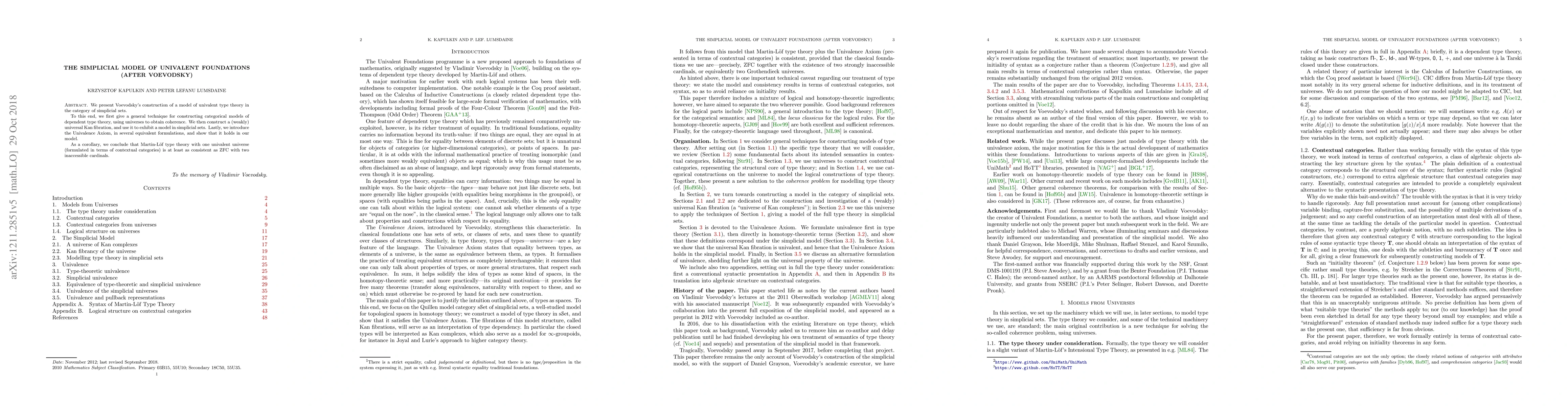 This paper constructs a model of univalent type theory using simplicial sets, building on Voevodsky’s work. It introduces a general method for creating categorical models of dependent type theory and demonstrates the consistency of Martin-Löf type theory relative to ZFC with additional set-theoretic assumptions.