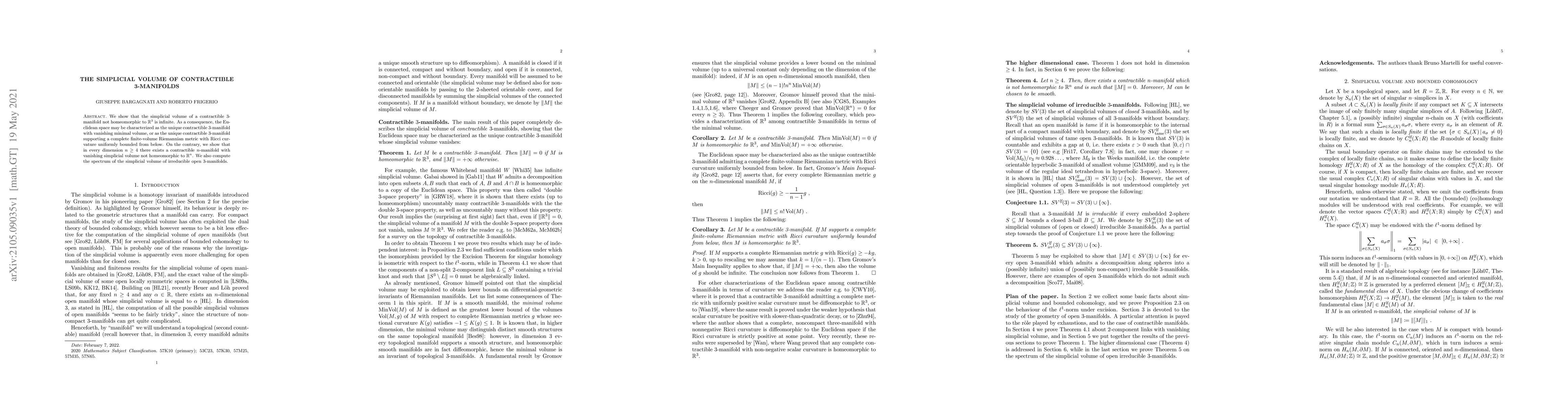 We show that the simplicial volume of a contractible 3-manifold not homeomorphic to $\mathbb{R}^3$ is infinite. As a consequence, the Euclidean space may be characterized as the unique contractible $3$-manifold with vanishing minimal volume, or as the unique contractible $3$-manifold supporting a complete finite-volume Riemannian metric with Ricci curvature uniformly bounded from below. On the contrary, we show that in every dimension $n\geq 4$ there exists a contractible $n$-manifold with vanishing simplicial volume not homeomorphic to $\mathbb{R}^n$. We also compute the spectrum of the simplicial volume of irreducible open 3-manifolds.