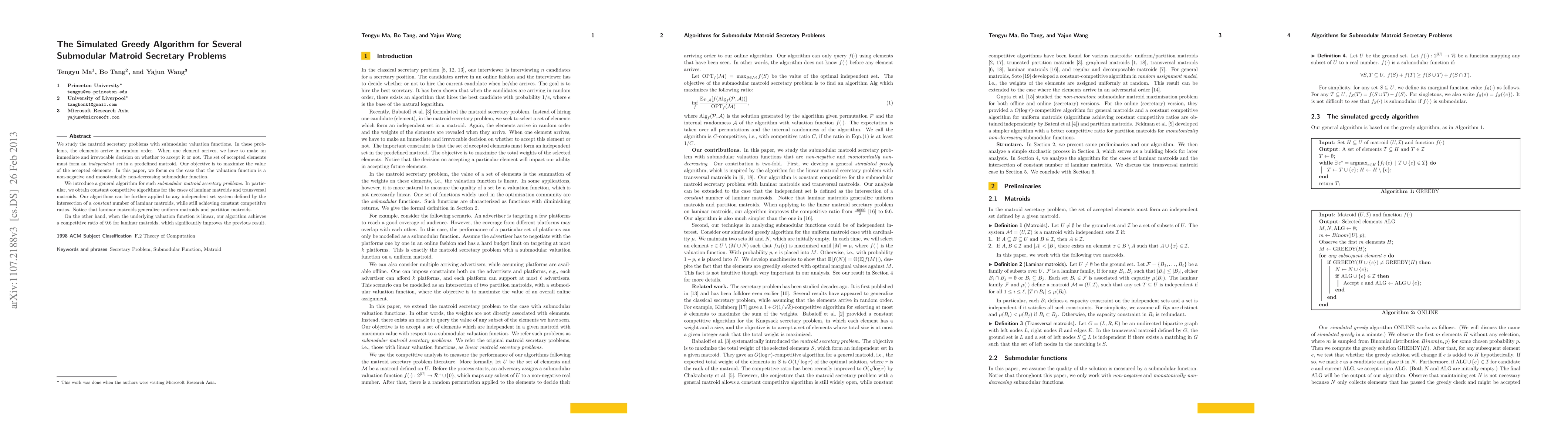 This paper introduces a simulated greedy algorithm for solving submodular matroid secretary problems where elements form independent sets in predefined matroids. It presents constant competitive algorithms for laminar and transversal matroids, improving the competitive ratio to 9.6 for linear valuation functions over laminar matroids.