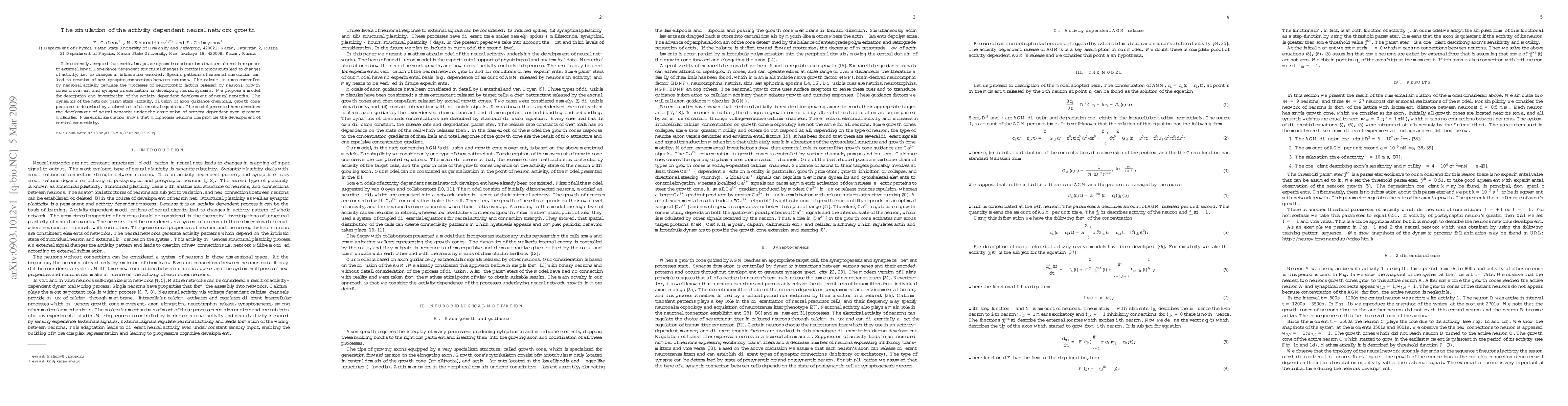 This paper proposes a mathematical model to simulate the activity-dependent growth of neural networks, focusing on how external stimulation influences synaptic connections and neurotrophic factors. The model uses differential equations to describe the dynamics of neural network parameters, revealing that morpholess neurons hinder cortical connectivity development.