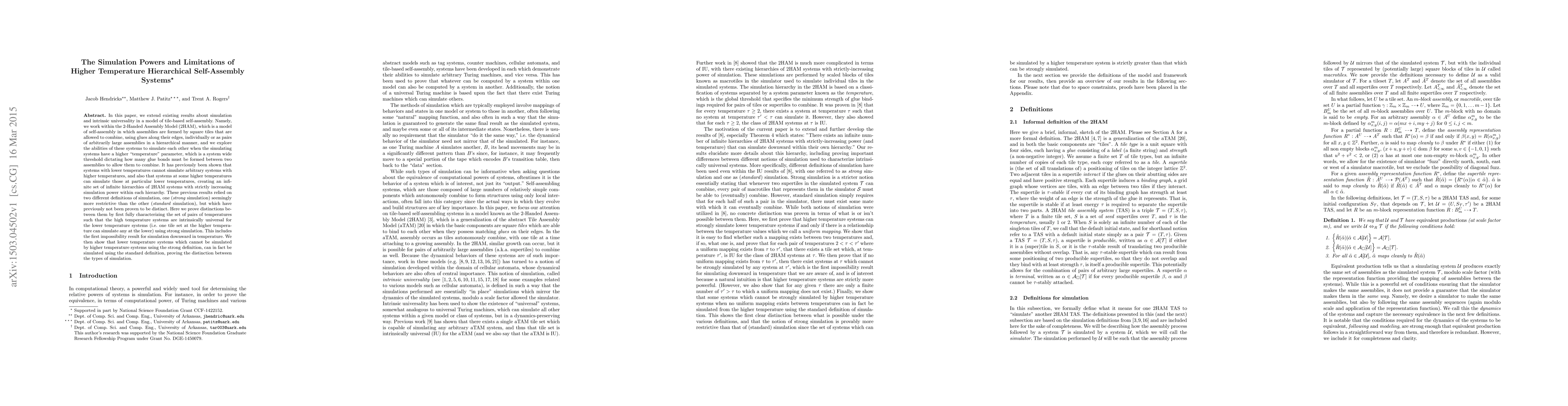 In this paper, we extend existing results about simulation and intrinsic universality in a model of tile-based self-assembly. Namely, we work within the 2-Handed Assembly Model (2HAM), which is a model of self-assembly in which assemblies are formed by square tiles that are allowed to combine, using glues along their edges, individually or as pairs of arbitrarily large assemblies in a hierarchical manner, and we explore the abilities of these systems to simulate each other when the simulating systems have a higher "temperature" parameter, which is a system wide threshold dictating how many glue bonds must be formed between two assemblies to allow them to combine. It has previously been shown that systems with lower temperatures cannot simulate arbitrary systems with higher temperatures, and also that systems at some higher temperatures can simulate those at particular lower temperatures, creating an infinite set of infinite hierarchies of 2HAM systems with strictly increasing simulation power within each hierarchy. These previous results relied on two different definitions of simulation, one (strong simulation) seemingly more restrictive than the other (standard simulation), but which have previously not been proven to be distinct. Here we prove distinctions between them by first fully characterizing the set of pairs of temperatures such that the high temperature systems are intrinsically universal for the lower temperature systems (i.e. one tile set at the higher temperature can simulate any at the lower) using strong simulation. This includes the first impossibility result for simulation downward in temperature. We then show that lower temperature systems which cannot be simulated by higher temperature systems using the strong definition, can in fact be simulated using the standard definition, proving the distinction between the types of simulation.