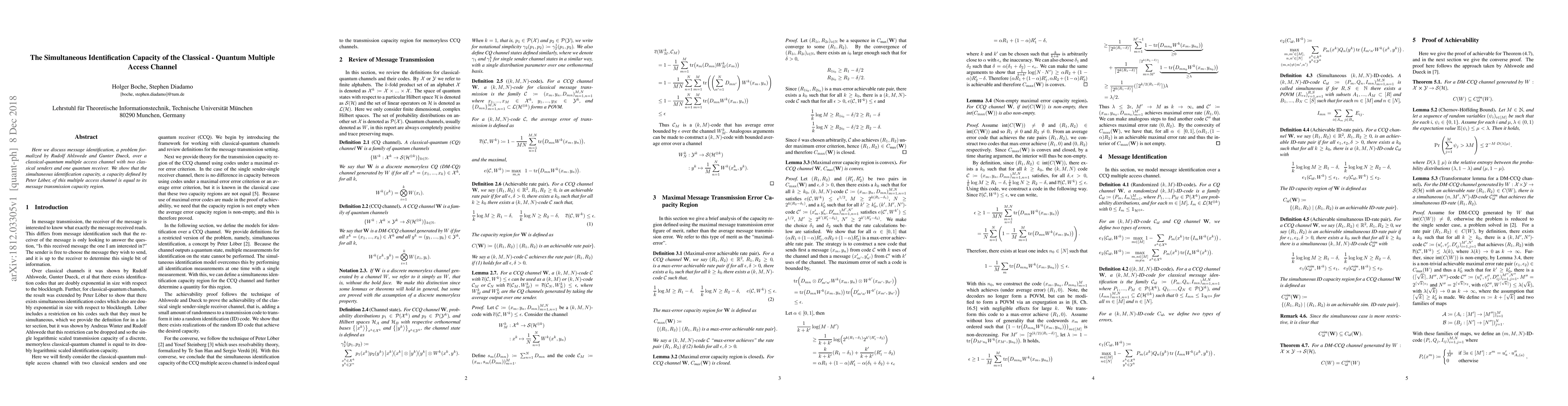 This paper explores the simultaneous identification capacity of a classical-quantum multiple access channel, demonstrating that the channel's simultaneous identification capacity equals its message transmission capacity region. The study builds on foundational work by Ahlswede and Dueck and extends it to quantum communication scenarios.