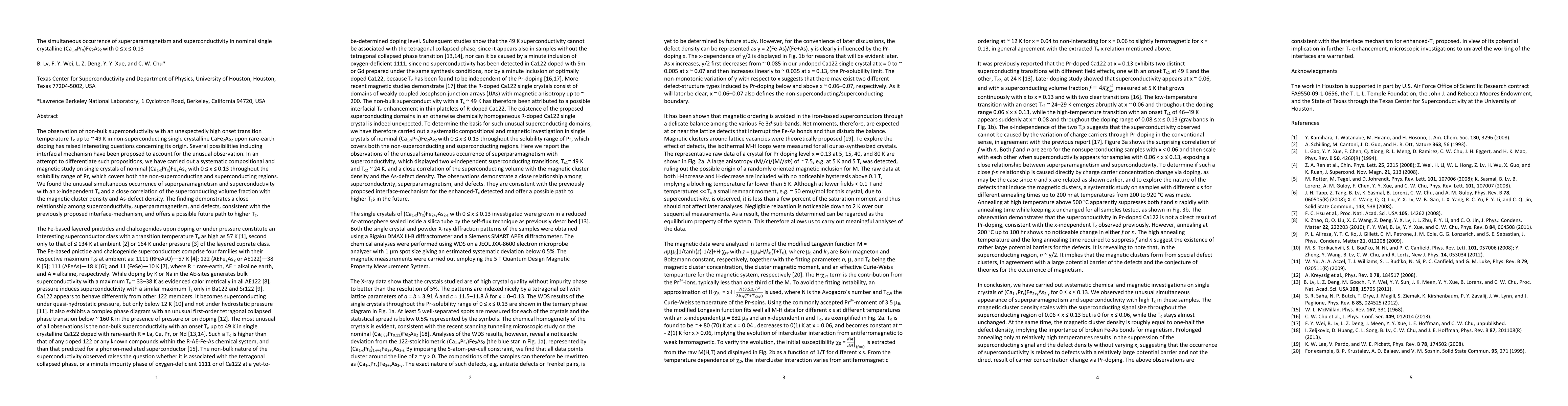 This study systematically examines single crystals of (Ca1-xPrx)Fe2As2, finding simultaneous superparamagnetism and superconductivity with a constant critical temperature (Tc) up to ~49K. The results suggest a strong link between superconductivity, superparamagnetism, and defects, supporting an interface-mechanism hypothesis for achieving higher Tc.