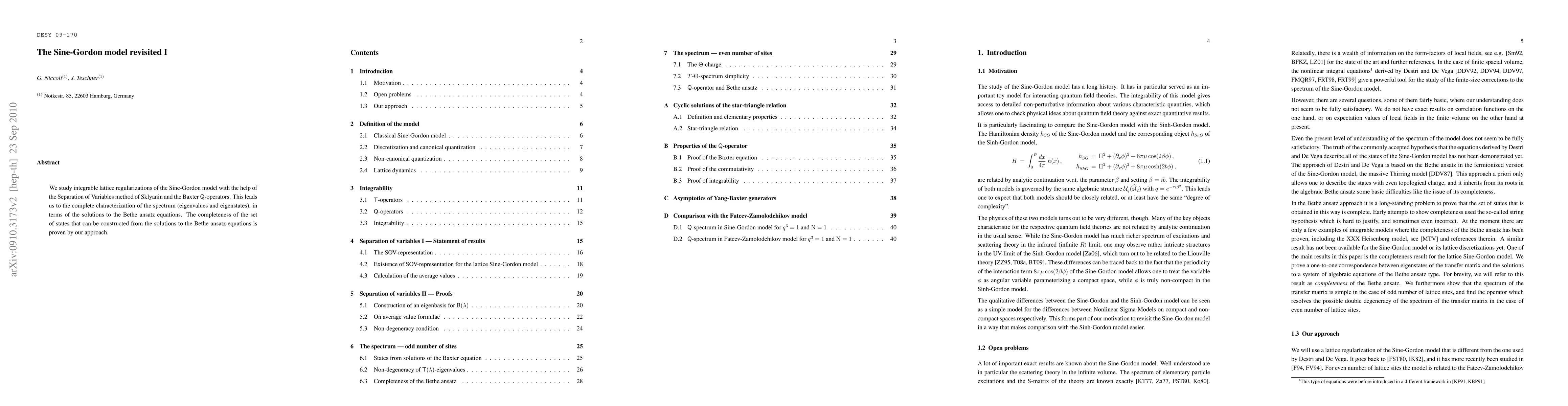 Researchers revisited the sine-Gordon model using lattice regularization and separation of variables method, leading to a complete characterization of its spectrum through Bethe ansatz equations, proving the completeness of states that can be constructed from these solutions.