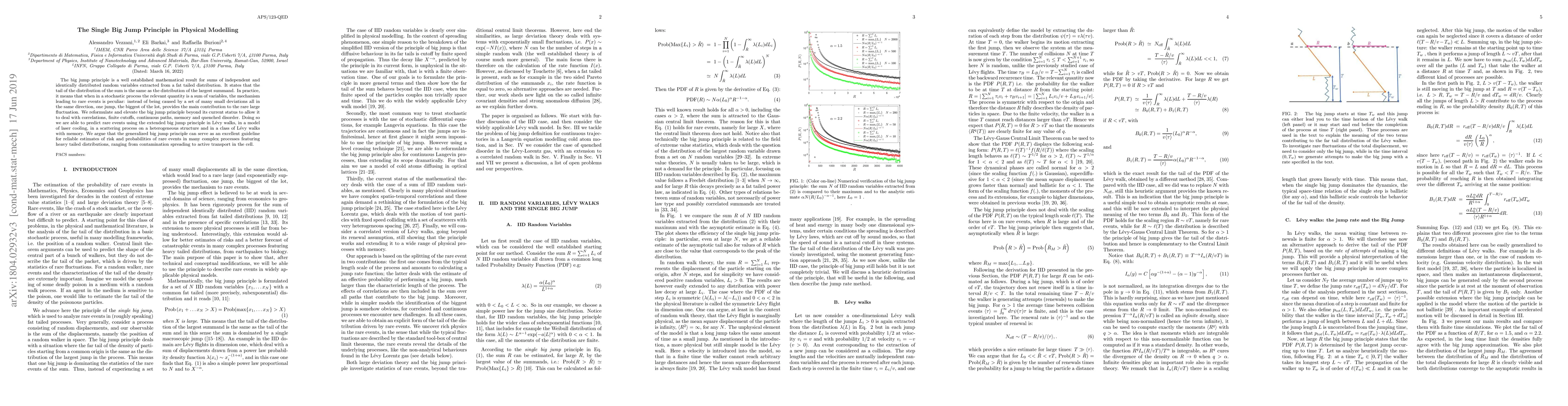 The big jump principle is a well established mathematical result for sums of independent and identically distributed random variables extracted from a fat tailed distribution. It states that the tail of the distribution of the sum is the same as the distribution of the largest summand. In practice, it means that when in a stochastic process the relevant quantity is a sum of variables, the mechanism leading to rare events is peculiar: instead of being caused by a set of many small deviations all in the same direction, one jump, the biggest of the lot, provides the main contribution to the rare large fluctuation. We reformulate and elevate the big jump principle beyond its current status to allow it to deal with correlations, finite cutoffs, continuous paths, memory and quenched disorder. Doing so we are able to predict rare events using the extended big jump principle in L\'evy walks, in a model of laser cooling, in a scattering process on a heterogeneous structure and in a class of L\'evy walks with memory. We argue that the generalized big jump principle can serve as an excellent guideline for reliable estimates of risk and probabilities of rare events in many complex processes featuring heavy tailed distributions, ranging from contamination spreading to active transport in the cell.