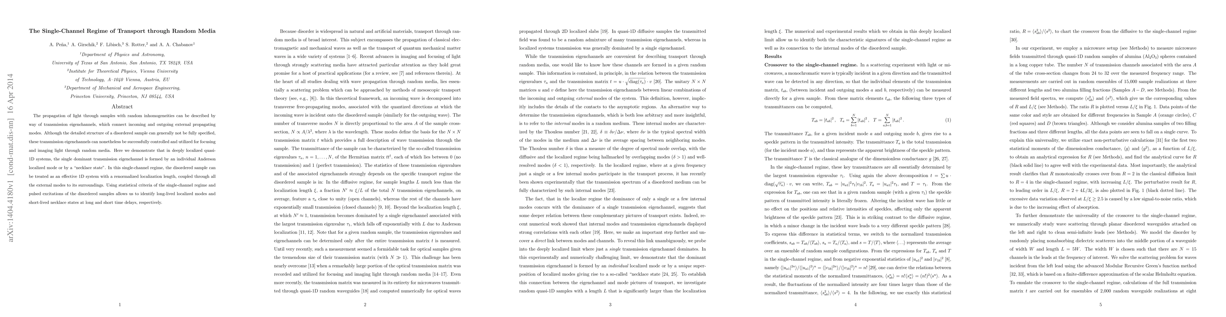 The propagation of light through samples with random inhomogeneities can be described by way of transmission eigenchannels, which connect incoming and outgoing external propagating modes. Although the detailed structure of a disordered sample can generally not be fully specified, these transmission eigenchannels can nonetheless be successfully controlled and utilized for focusing and imaging light through random media. Here we demonstrate that in deeply localized quasi-1D systems, the single dominant transmission eigenchannel is formed by an individual Anderson localized mode or by a "necklace state". In this single-channel regime, the disordered sample can be treated as an effective 1D system with a renormalized localization length, coupled through all the external modes to its surroundings. Using statistical criteria of the single-channel regime and pulsed excitations of the disordered samples allows us to identify long-lived localized modes and short-lived necklace states at long and short time delays, respectively.