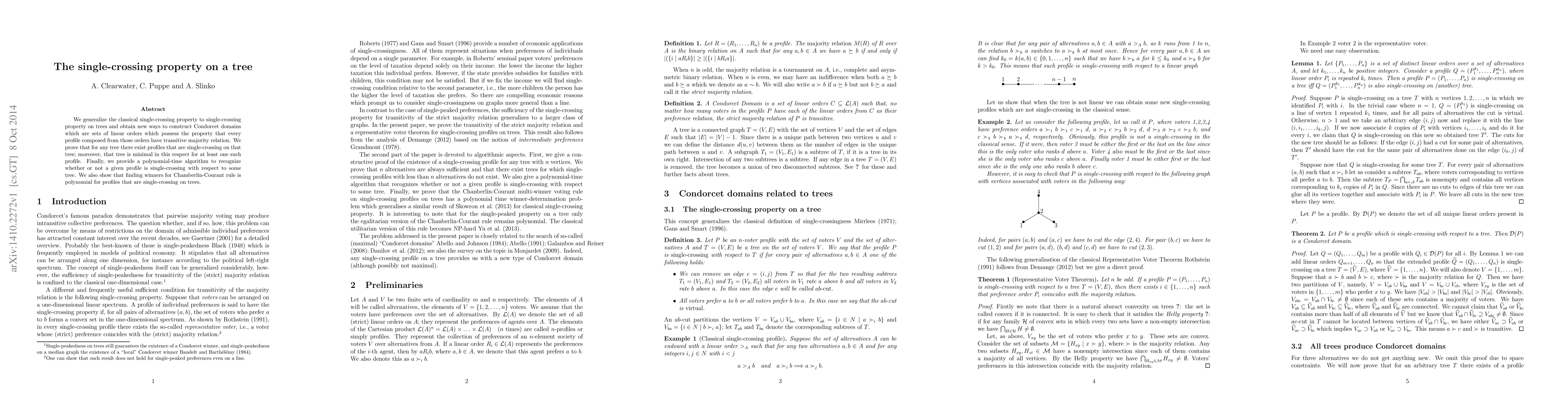 This paper generalizes the single-crossing property to trees, constructing Condorcet domains with transitive majority relations. It proves the existence of minimal trees for specific profiles and provides a polynomial-time algorithm to recognize single-crossing profiles on trees, along with polynomial solutions for Chamberlin-Courant rule winners.
