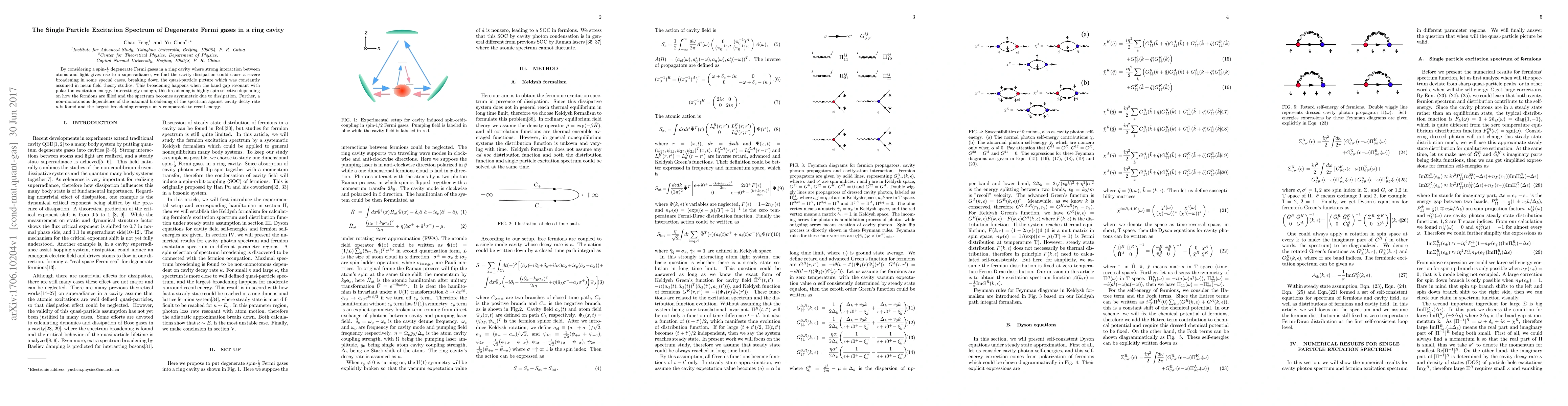 This study investigates the single particle excitation spectrum of spin-$\frac{1}{2}$ degenerate Fermi gases in a ring cavity, revealing that cavity dissipation can cause severe broadening in the spectrum, especially when the band gap resonates with polariton excitation energy. This broadening is spin-selective and asymmetric, with the largest effect occurring when the cavity decay rate is comparable to the recoil energy.