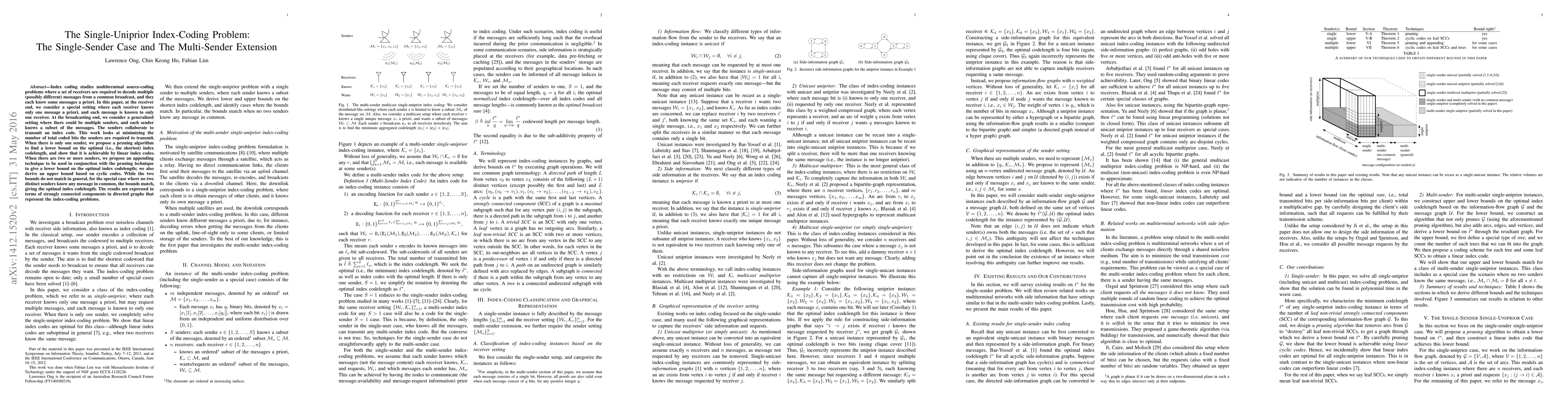 Index coding studies multiterminal source-coding problems where a set of receivers are required to decode multiple (possibly different) messages from a common broadcast, and they each know some messages a priori. In this paper, at the receiver end, we consider a special setting where each receiver knows only one message a priori, and each message is known to only one receiver. At the broadcasting end, we consider a generalized setting where there could be multiple senders, and each sender knows a subset of the messages. The senders collaborate to transmit an index code. This work looks at minimizing the number of total coded bits the senders are required to transmit. When there is only one sender, we propose a pruning algorithm to find a lower bound on the optimal (i.e., the shortest) index codelength, and show that it is achievable by linear index codes. When there are two or more senders, we propose an appending technique to be used in conjunction with the pruning technique to give a lower bound on the optimal index codelength; we also derive an upper bound based on cyclic codes. While the two bounds do not match in general, for the special case where no two distinct senders know any message in common, the bounds match, giving the optimal index codelength. The results are expressed in terms of strongly connected components in directed graphs that represent the index-coding problems.