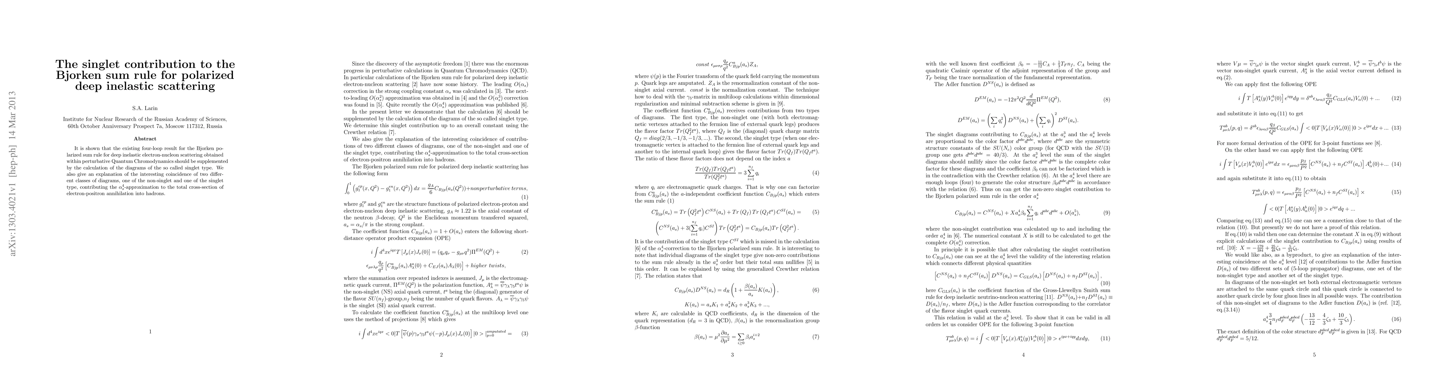 Researchers found that the Bjorken polarized sum rule for deep inelastic scattering requires an additional calculation of singlet diagrams to accurately describe the process. This discovery has implications for our understanding of QCD in high-energy collisions.