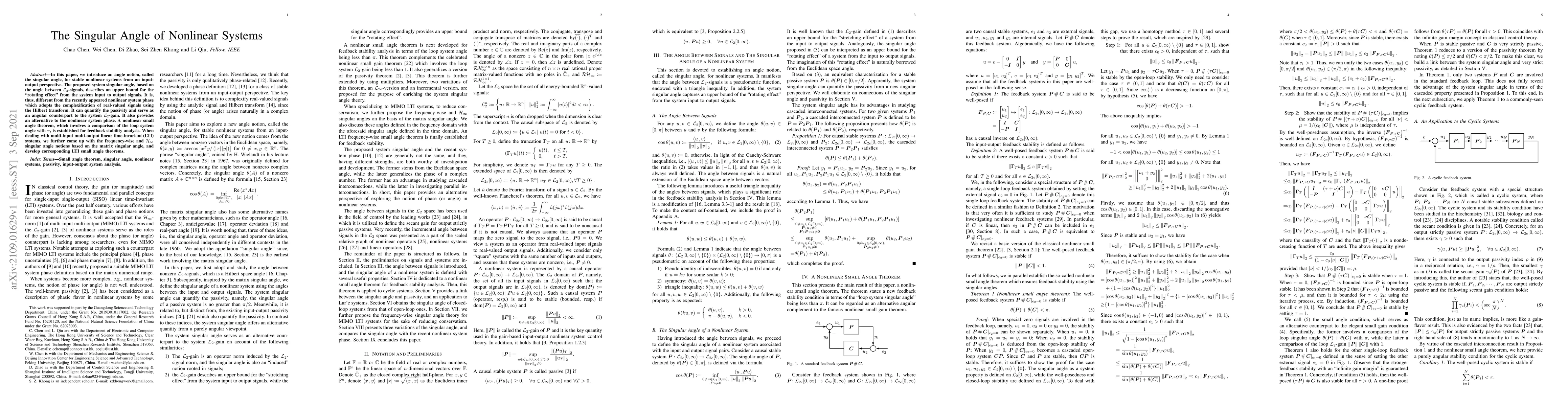 In this paper, we introduce an angle notion, called the singular angle, for stable nonlinear systems from an input-output perspective. The proposed system singular angle, based on the angle between $\mathcal{L}_2$-signals, describes an upper bound for the "rotating effect" from the system input to output signals. It is, thus, different from the recently appeared nonlinear system phase which adopts the complexification of real-valued signals using the Hilbert transform. It can quantify the passivity and serve as an angular counterpart to the system $\mathcal{L}_2$-gain. It also provides an alternative to the nonlinear system phase. A nonlinear small angle theorem, which involves a comparison of the loop system angle with $\pi$, is established for feedback stability analysis. When dealing with multi-input multi-output linear time-invariant (LTI) systems, we further come up with the frequency-wise and $\mathcal{H}_\infty$ singular angle notions based on the matrix singular angle, and develop corresponding LTI small angle theorems.