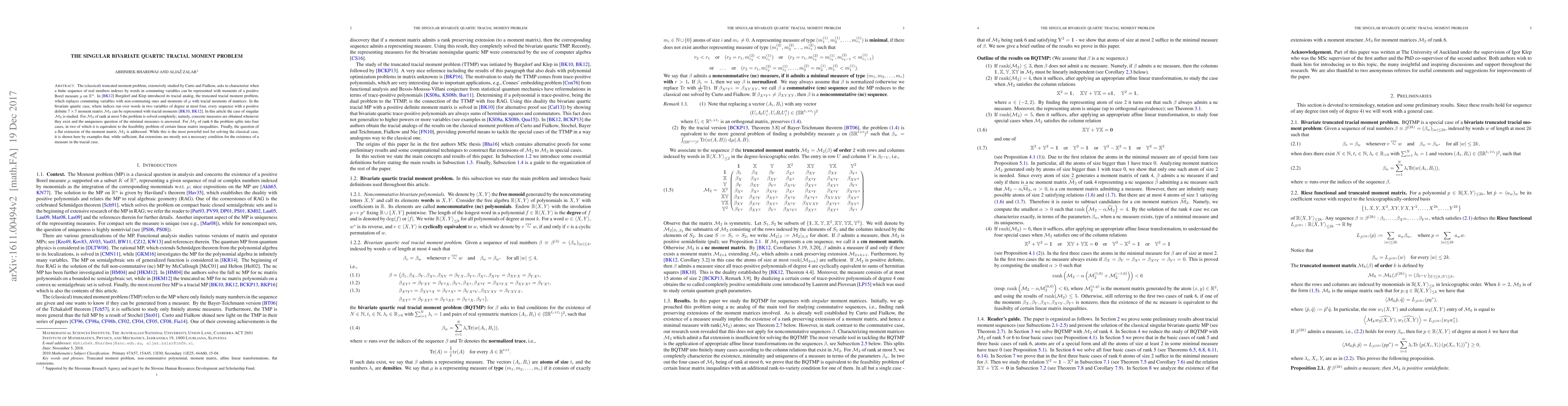The (classical) truncated moment problem, extensively studied by Curto and Fialkow, asks to characterize when a finite sequence of real numbers indexes by words in commuting variables can be represented with moments of a positive Borel measure $\mu$ on $\mathbb R^n$. In \cite{BK12} Burgdorf and Klep introduced its tracial analog, the truncated tracial moment problem, which replaces commuting variables with non-commuting ones and moments of $\mu$ with tracial moments of matrices. In the bivariate quartic case, where indices run over words in two variables of degree at most four, every sequence with a positive definite $7\times 7$ moment matrix $\mathcal M_2$ can be represented with tracial moments \cite{BK10,BK12}. In this article the case of singular $\mathcal M_2$ is studied. For $\mathcal M_2$ of rank at most 5 the problem is solved completely; namely, concrete measures are obtained whenever they exist and the uniqueness question of the minimal measures is answered. For $\mathcal M_2$ of rank 6 the problem splits into four cases, in two of which it is equivalent to the feasibility problem of certain linear matrix inequalities. Finally, the question of a flat extension of the moment matrix $\mathcal M_2$ is addressed. While this is the most powerful tool for solving the classical case, it is shown here by examples that, while sufficient, flat extensions are mostly not a necessary condition for the existence of a measure in the tracial case.