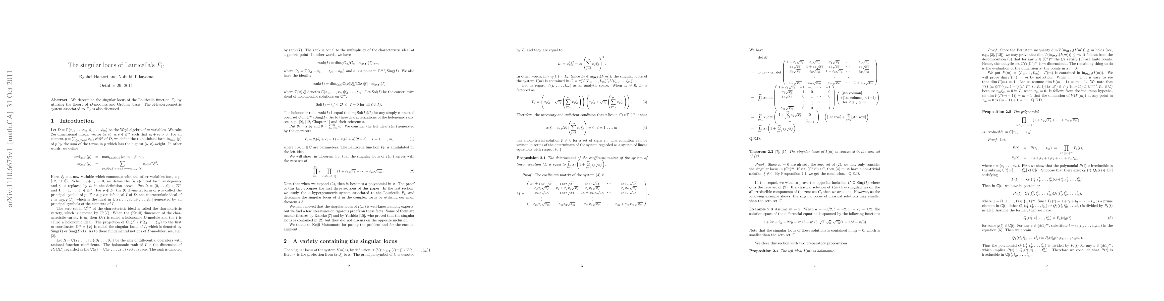 Summary: The paper identifies the singular locus of Lauricella's function $F_C$ using $D$-modules and Gr\"obner basis, and explores the associated $A$-hypergeometric system.
